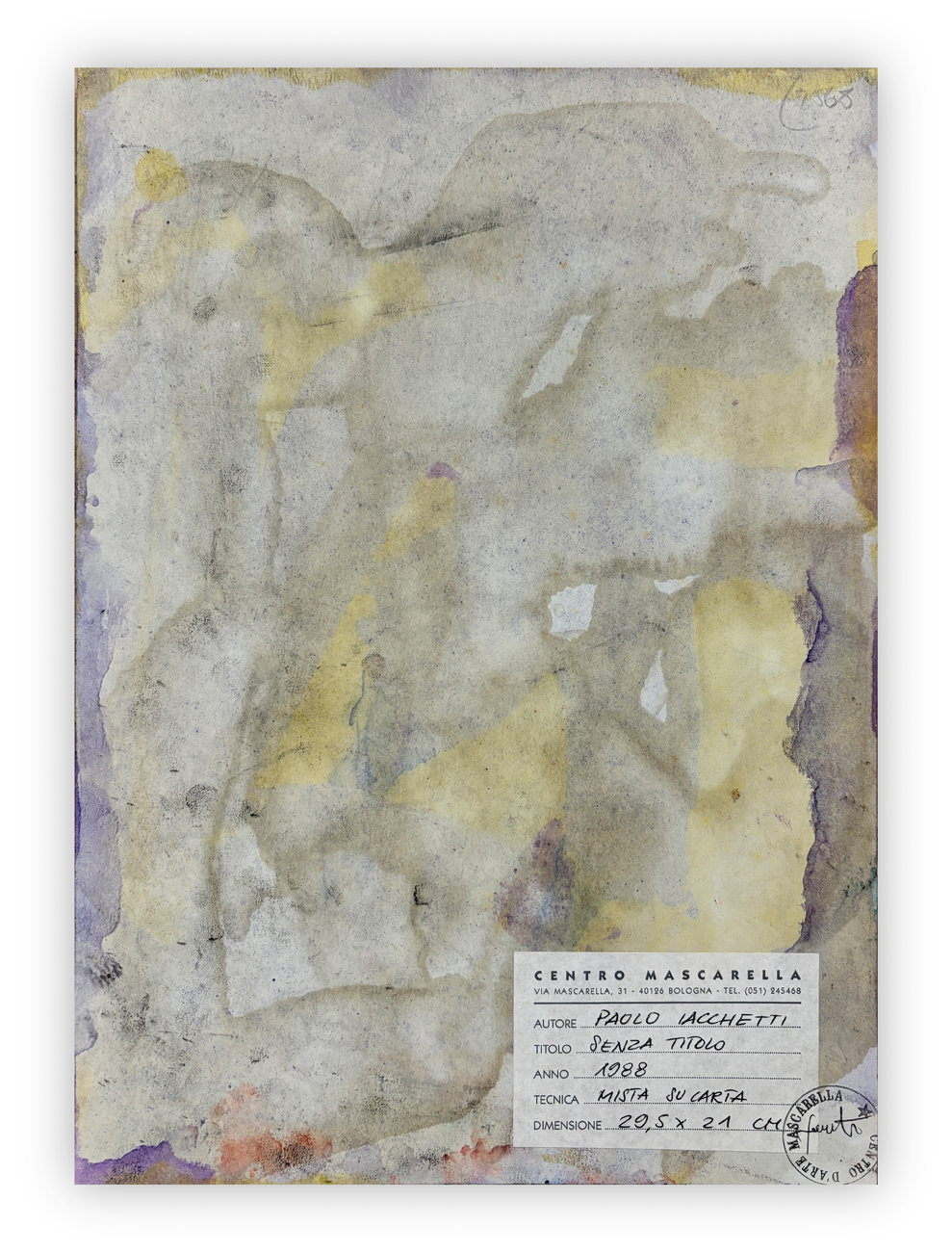 Etichetta e timbro del Centro Mascarella (BO) recante caratteristiche tecniche dell'opera al retro