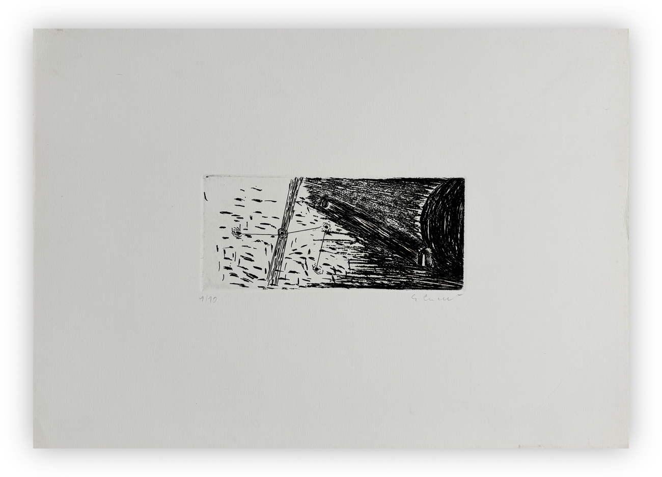 Opera originariamente parte della cartella 'Duetto - Numero uno' a cura di Francesco Moschini, contenente 8 acqueforti-acquetinte originali di Enzo Cucchi e Dario Passi