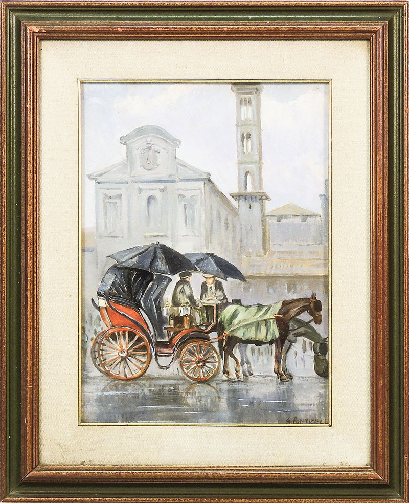 GRACCO PONTICELLI (1908-1980) Carrozzelle sotto la pioggia in Piazza Ognissanti 1971 - Coaches in the Rain in Piazza Ognissanti olio su cartone telato - oil on canvas board, firmato, al verso firmato, dedicato, datato e titolato, in cornice cm 40x30