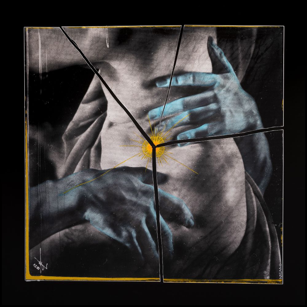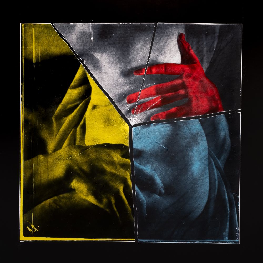 Danilo Mauro Malatesta, artista e fotoreporter, sfrutta l’antica tecnica dell’ambrotipia per raccontare un momento di rinascita. Il vetro, sensibilizzato al collodio umido, riflette l’immagine della sublime violenza mitologica del barocco, una Proserpina indifesa e disperata nella forte stretta di Plutone. Rompendo la lastra l’artista interviene su quella morsa avvinghiante, spezza quella violenza e tutto quello che porta con sé, quello che nel marmo del Bernini, c’è chi dimentica di cogliere. La manipolazione cromatica applicata nella stampa a contatto della lastra in frantumi allude al viaggio nell’Ade e alla successiva, faticosa, risalita.Il trittico in asta è l’unica rielaborazione prodotta dall’artista dell’opera in mostra personale permanente nell’Oratorio di Santa Silvia nella Chiesa rettoria di Sant’Andrea al Celio, tra gli affreschi di Guido Reni e Domenichino. Si tratta di una riproduzione e non di una copia poiché la complessa tecnica di stampa a contatto delle lastre spezzate comporta inevitabilmente delle variazioni e ciò rende ogni stampa unica e irripetibile.