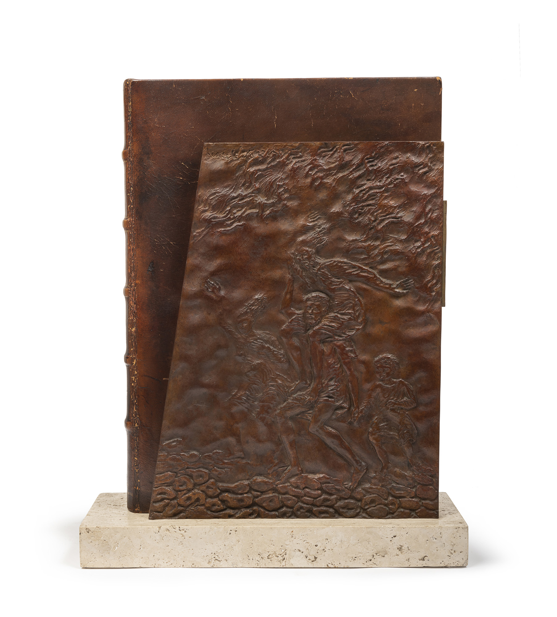 Supporto realizzato con due bassorilievi in bronzo fuso su piedistallo di travertino. Copertina in pelle.