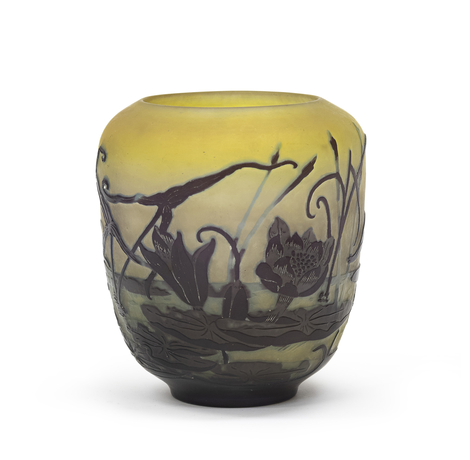 in vetro a cammeo inciso all'acido nei toni del marrone e fondo giallo. Decoro lacustre con motivo floreale e fogliato.