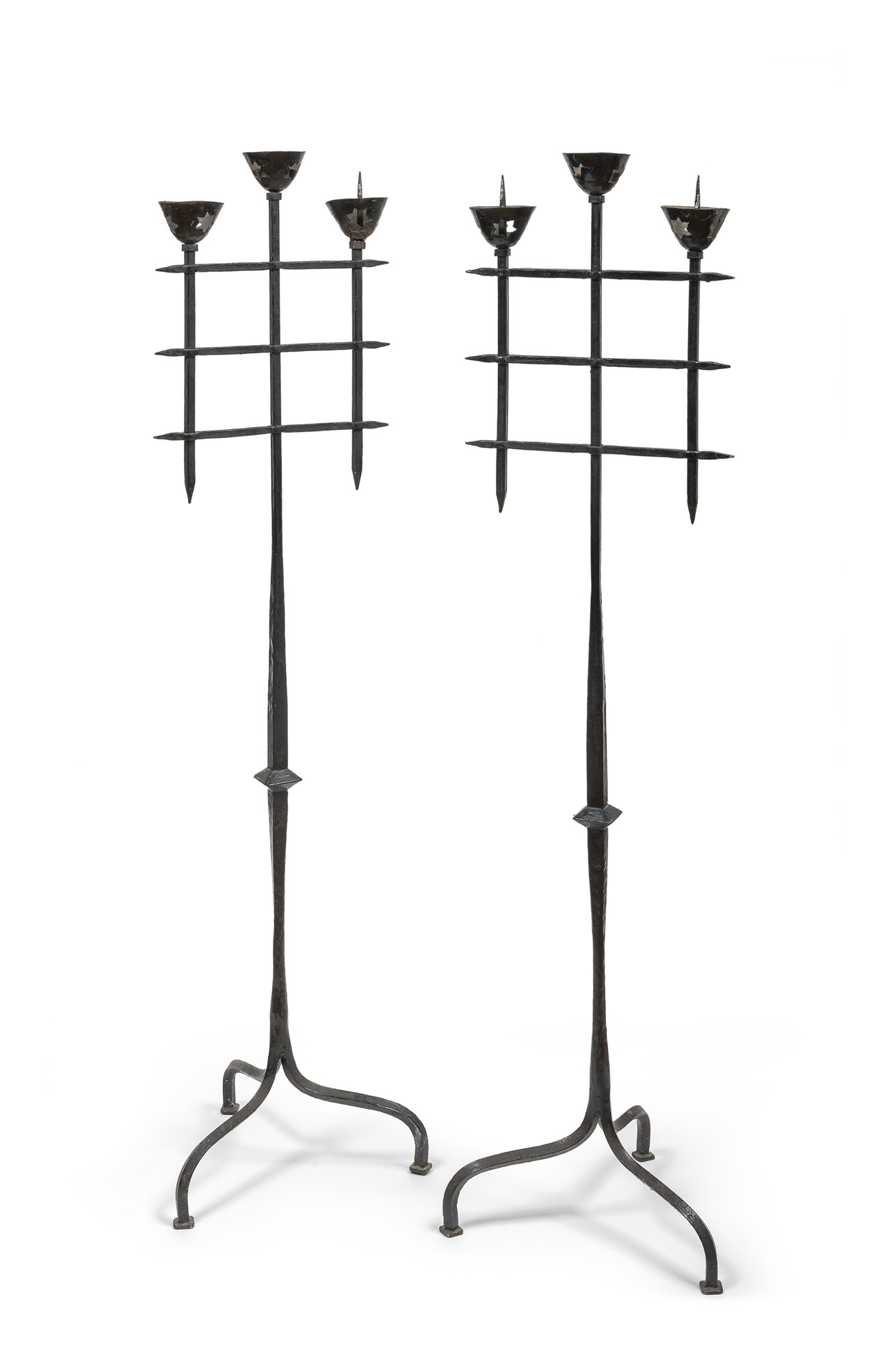a tre luci con struttura in ferro battuto a forma di grata, alto fusto e tre piedi curvi.
