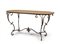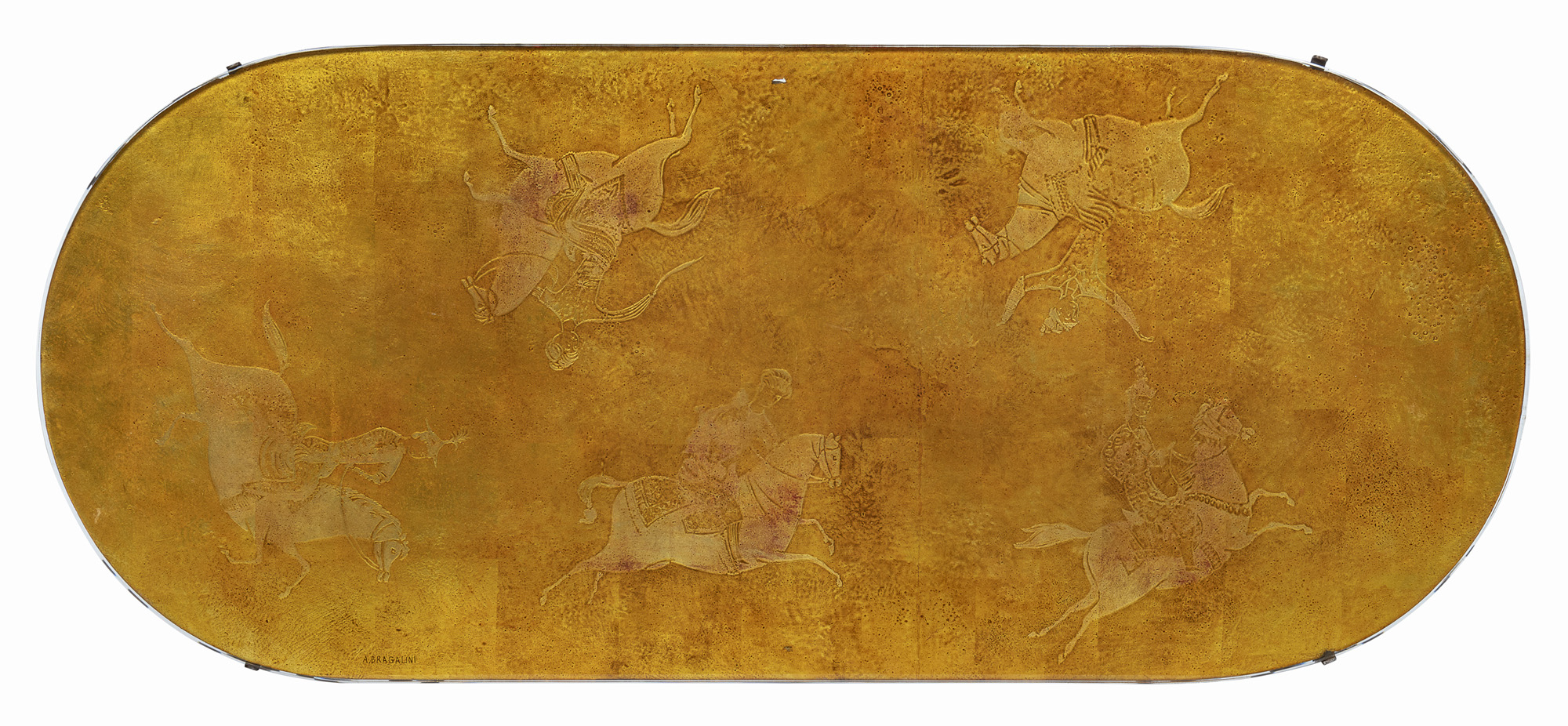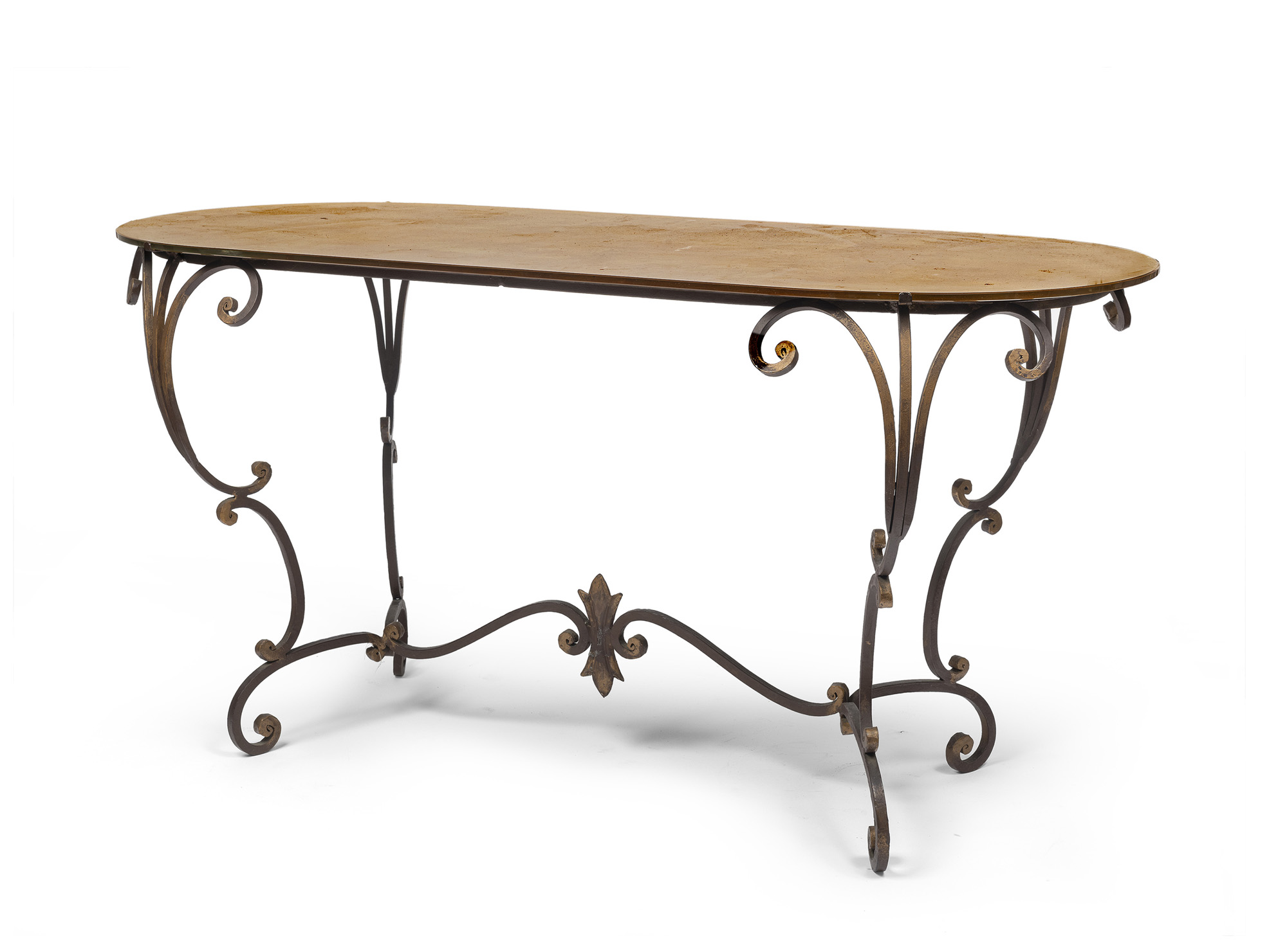 con piano in vetro dipinto a fondo oro con corsa di cavalieri turchi. Struttura in ferro battuto.