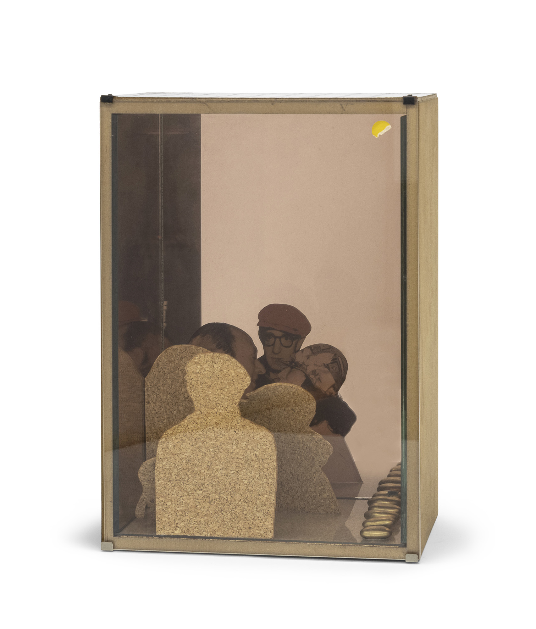 Scatola specchiante contenente le fotografie colorate a mano di Woody Allen, Adriana Chiesa e Carlo Di Palma, sagome in sughero e confetti dorati, cm. 37,5 x 26 x 17