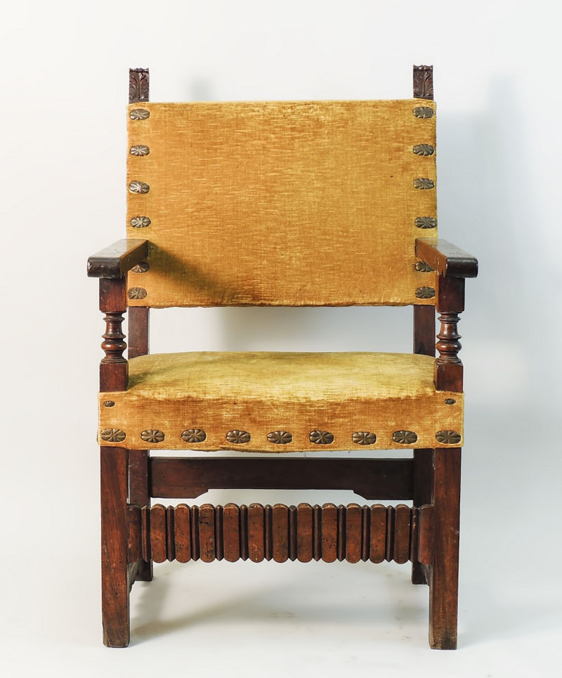 POLTRONA IN NOCE - WALNUT ARMCHAIR realizzata in stile Neorinascimentale, schienale con finali intagliati a foggia di palmette, braccioli a giorno desinenti a ricciolo, gambe dritte riunite da traverse, quella anteriore intagliata ad ovuli, seduta e schienale rivestiti in velluto giallo senape