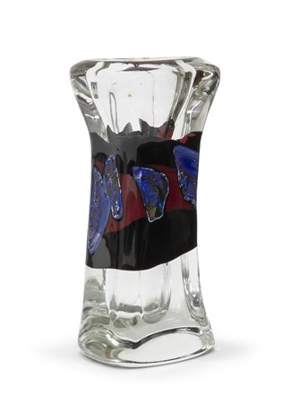 in vetro a fondo trasparente con decoro a fascia opaline nero e motivi astratto nei toni del bordeaux, blu e inclusioni di avventurina.