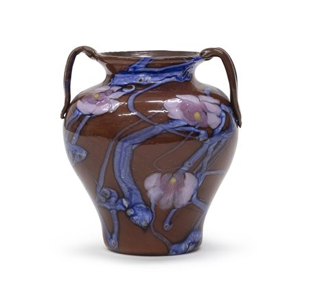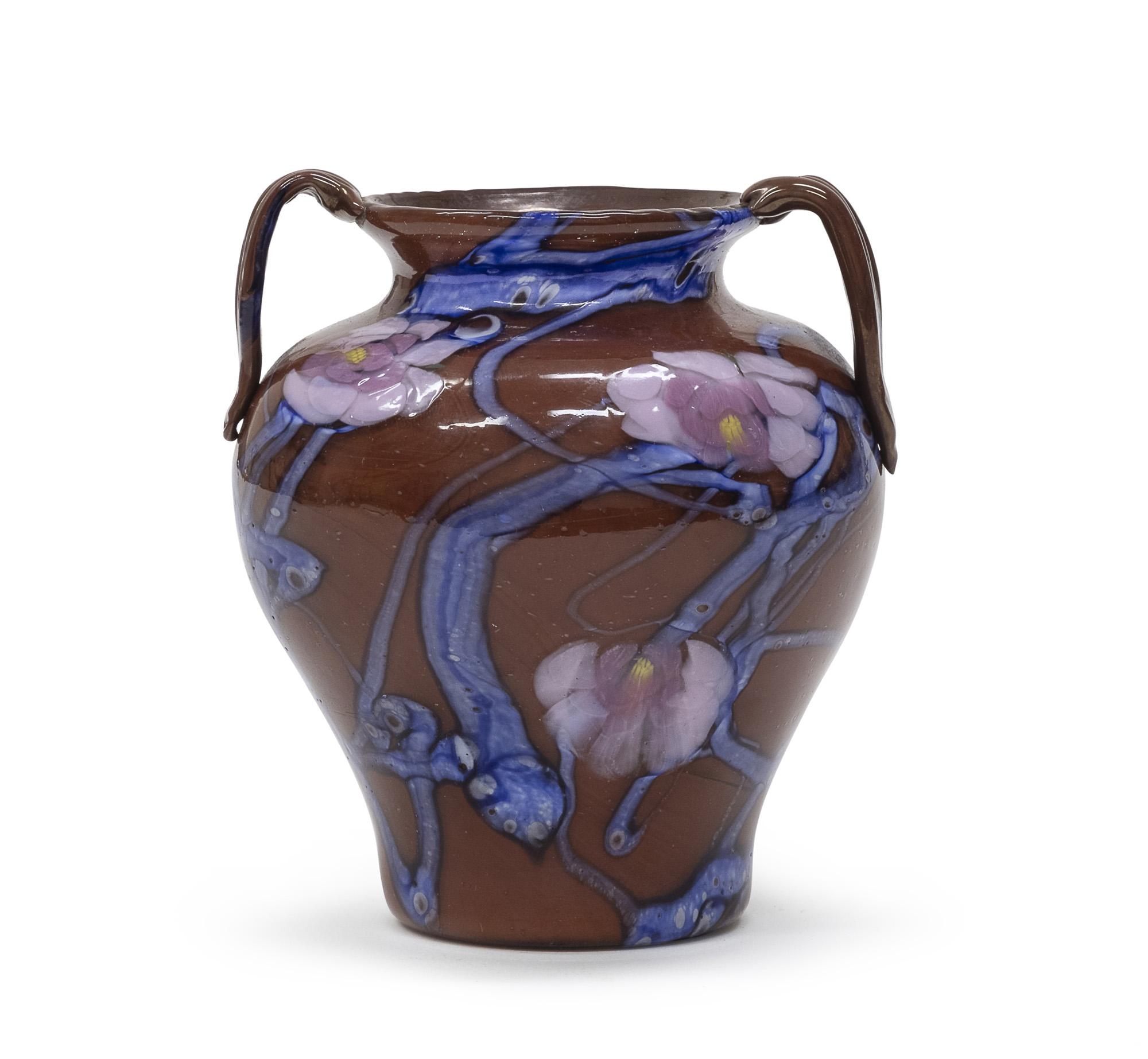 in vetro soffiato a murrine policrome raffiguranti fiori e racemi su fondo mattone. Anse applicate a caldo.
