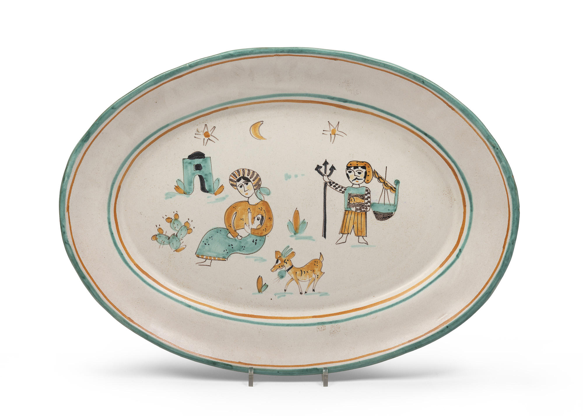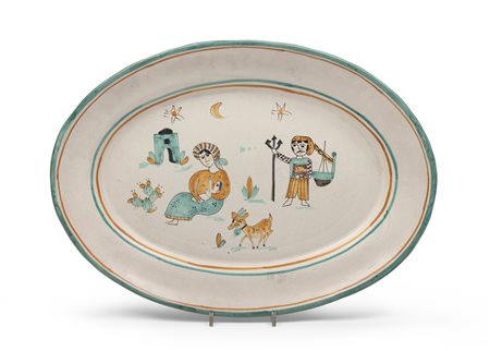 in policromia, con decorazione raffigurante pescatori e donna con bambino.
