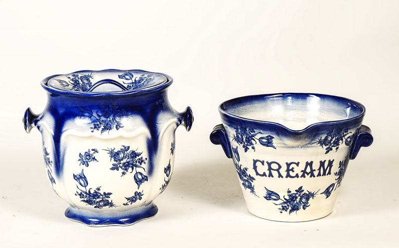LOTTO - LOT un vaso con coperchio ed una cremiera in terraglia inglese, entrambi decorati in monocromia blu h cm 26, h cm 20 (2)