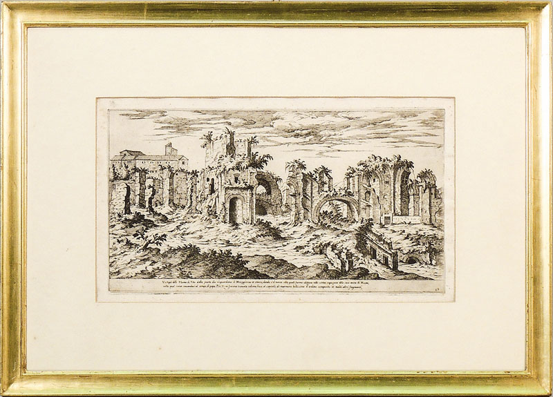 ETIENNE DUPERAC (1525-1604) Vestigia delle Terme di Tito - Ruins of Terme di Tito acquaforte - etching, in cornice foxing cm 21x37,5