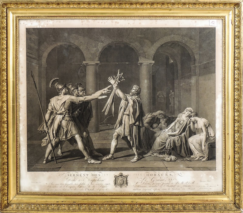 IL GIURAMENTO DEGLI ORAZI - OATH OF THE HORATII inizio del XIX secolo - beginning of 19th Century incisione francese - French engraving, foxing, in cornice coeva cm 65x72