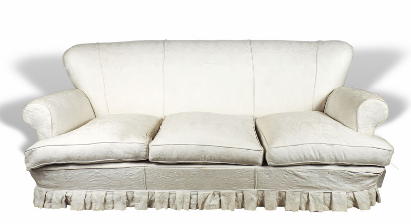 DIVANO A TRE POSTI - WHITE UPHOLSTERED SOFA alto schienale, braccioli rovesciati, imbottito e rivestito in tessuto damascato bianco lungh cm 195