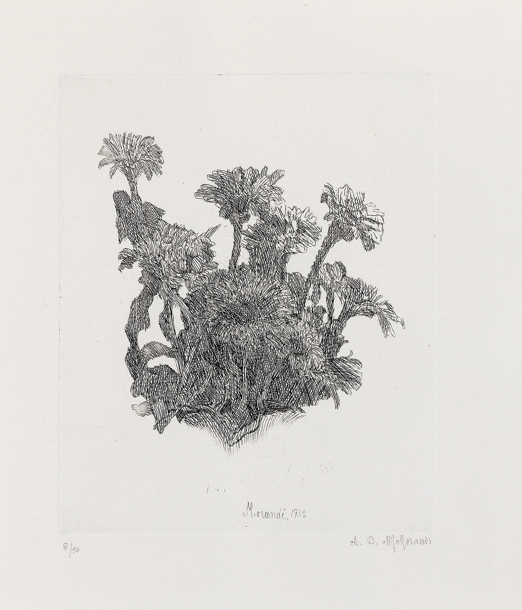 Firma e data in lastra in basso al centro: Morandi 1932, firma delle sorelle Morandi sul margine in basso a destra: A.D.MT. Morandi, tiratura in basso a sinistra: 8/10.