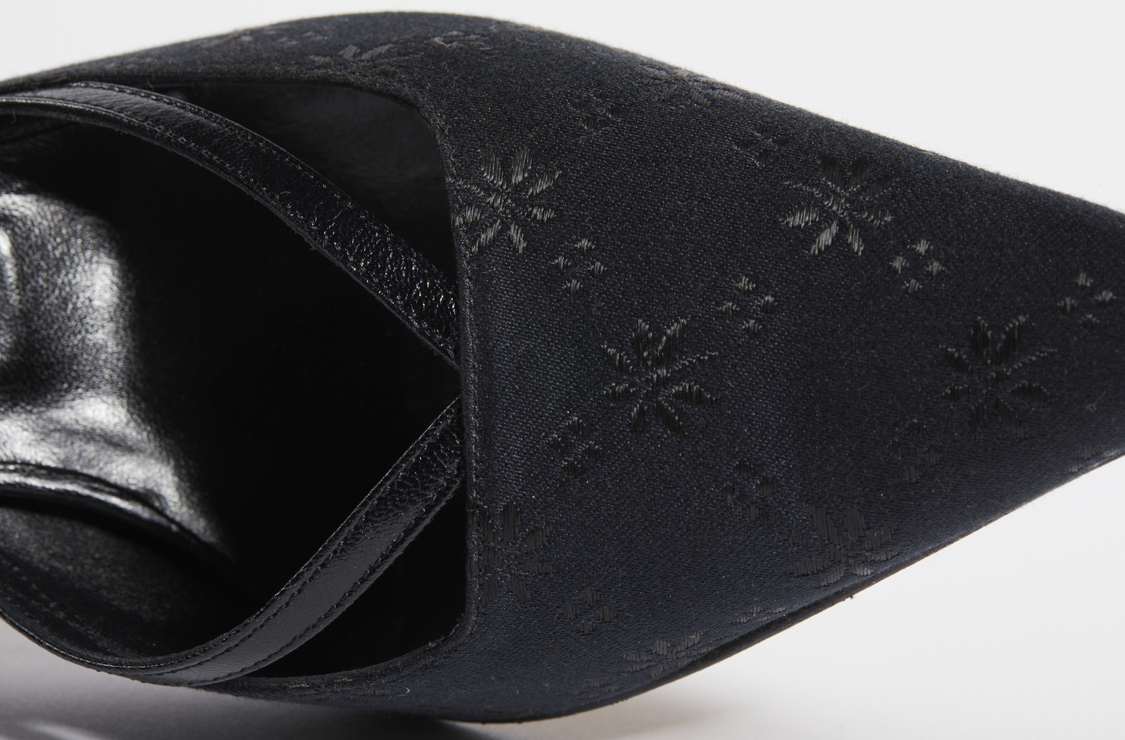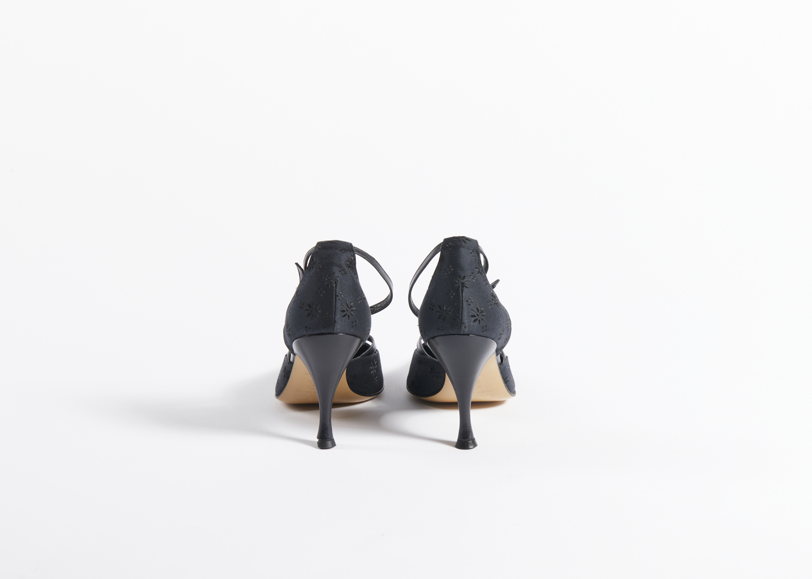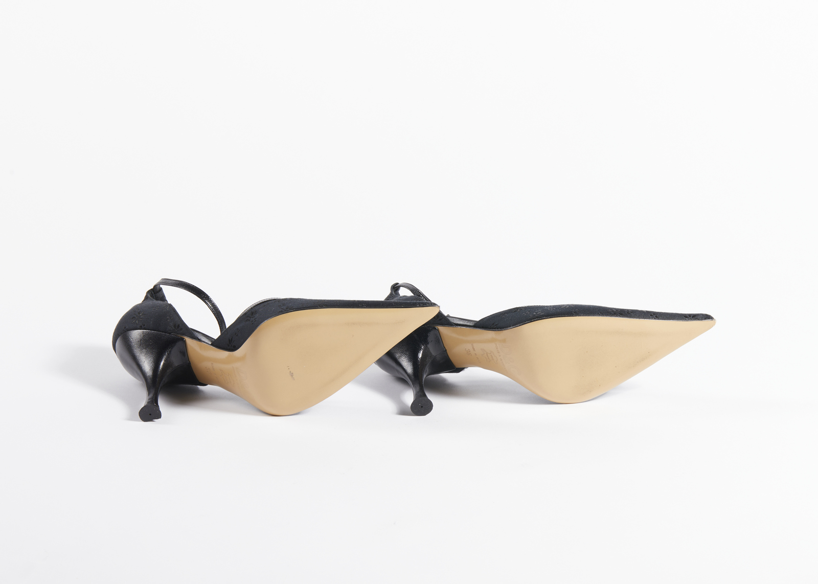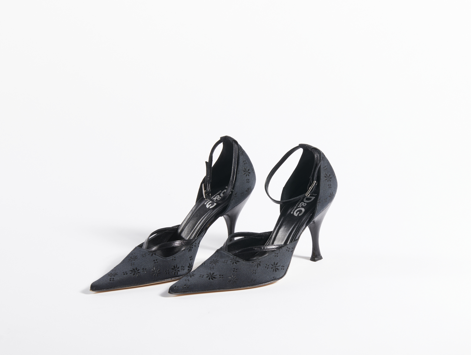 DOLCE E GABBANA Scarpe. Tessuto e pelle. Cm 25,50 x 15,00 x 6,50. Scarpe in tela nera e pelle con motivi floreali e cinturino da caviglia. Taglia 36It. Tacco 8cm.