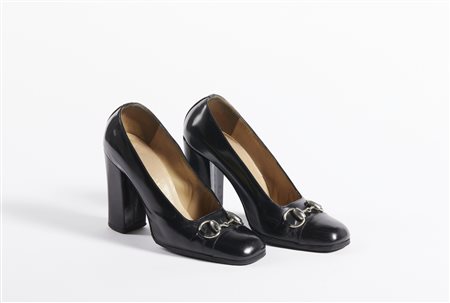 GUCCI Scarpe con tacco in pelle nera lucida . Pelle. Cm 21,00 x 15,00 x 7,00. Scarpe con tacco in pelle nero lucida n. 38, decorazione in metallo color argento sulla punta.