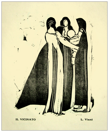LORENZO VIANI Viareggio 1882 – Ostia 1936 Il vicinato Xilografia. Firma (stampata) in b. a d., titolo in b. a s. (50 x 35 foglio – 27 x 21,5 xilo.) L’opera fa parte della cartella “Il martirio” composta da 12 xilografie tratte dagli studi del quadro “La Benedizione dei morti nel mare” che l’artista fece per la Casa Comunale del suo paese (Viareggio). Opere stampate presso la tipografia O. Ciani, Viareggio.