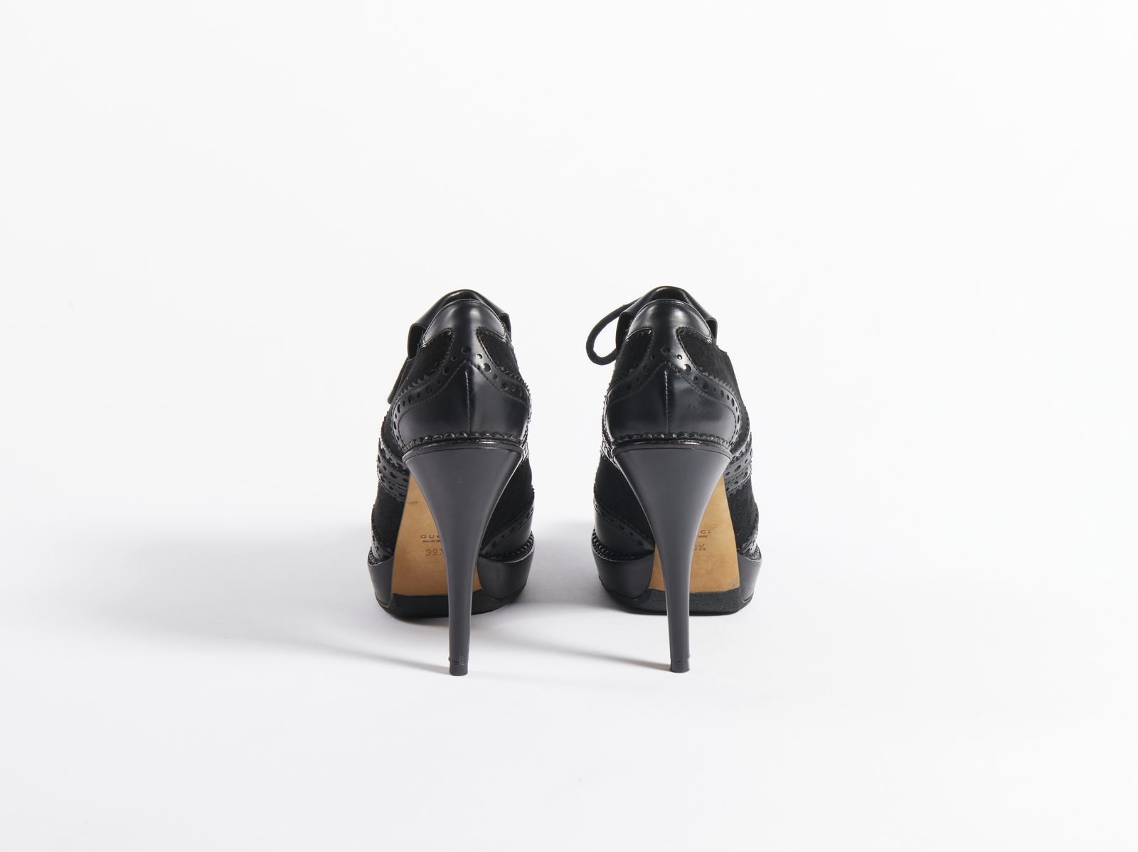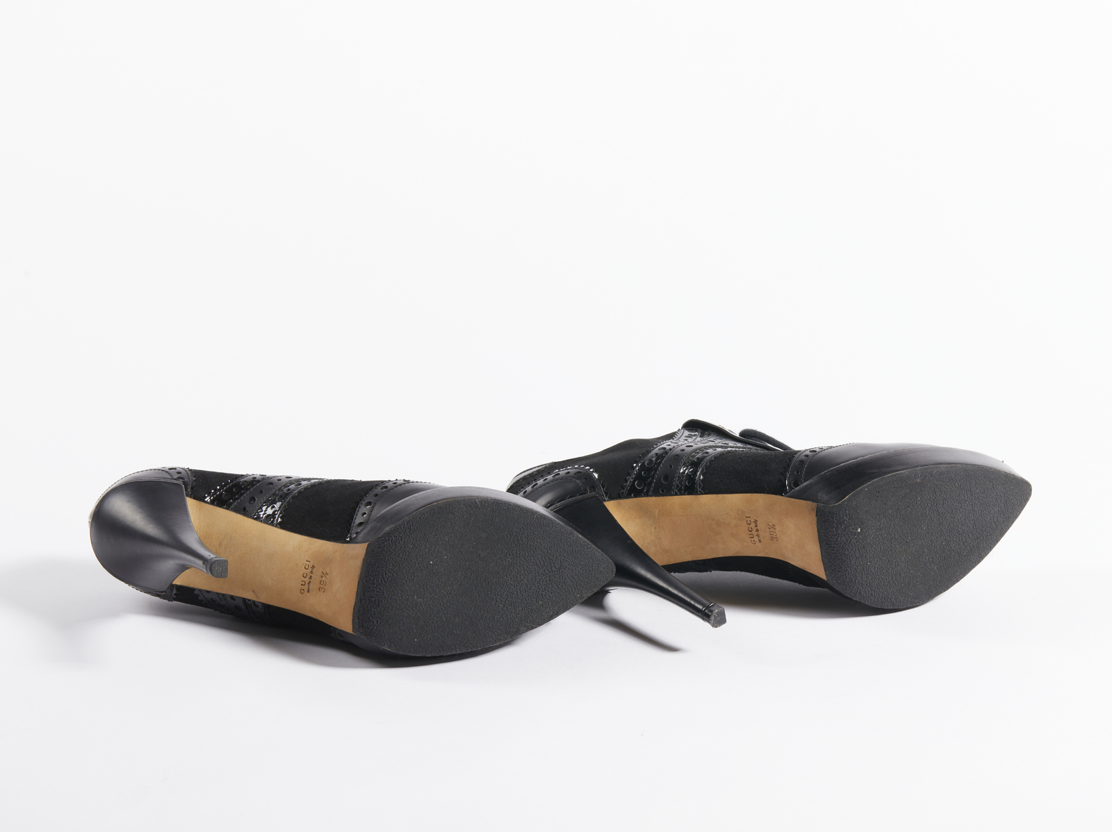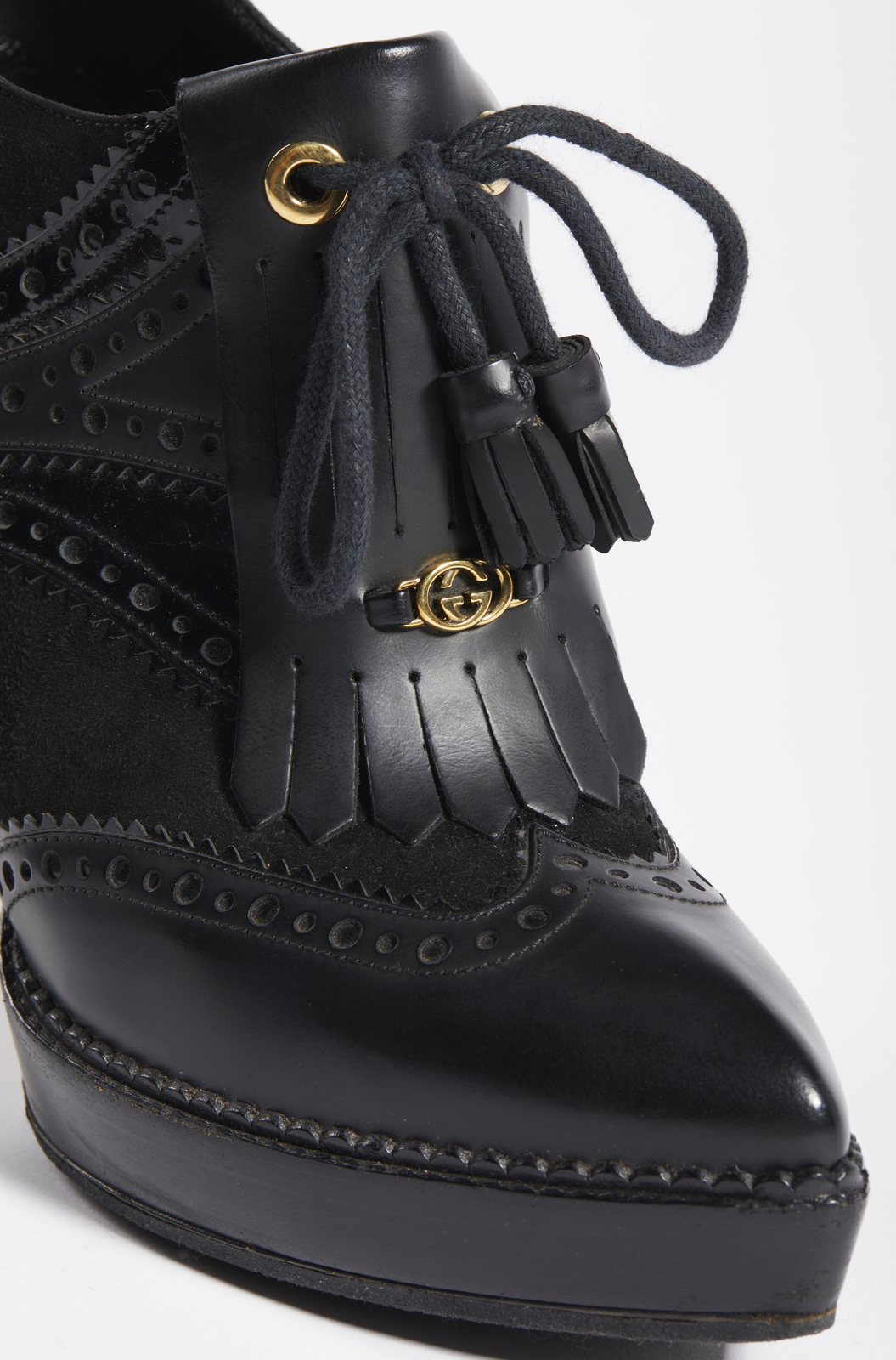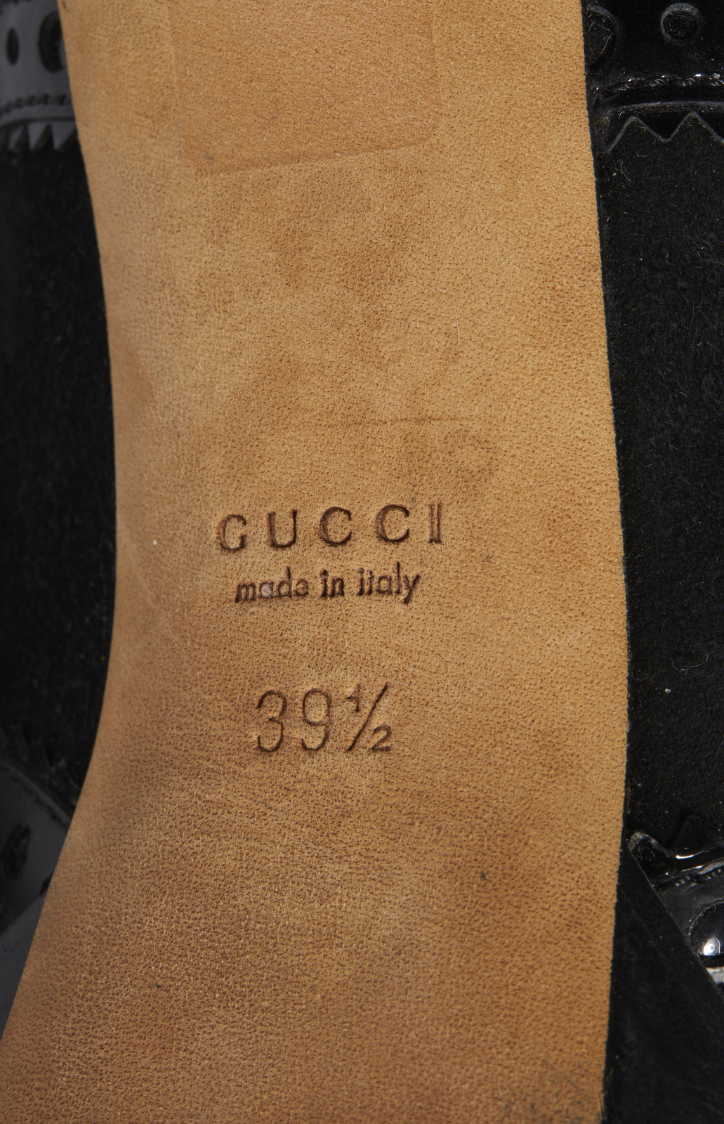 GUCCI Scarpa Francesina. Pelle e cuoio.. Cm 8,00 x 21,00. Scarpa francesina con lacci in pelle scamosciata, pelle, vernice.