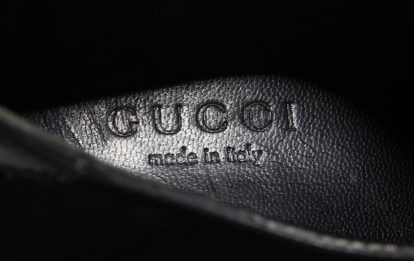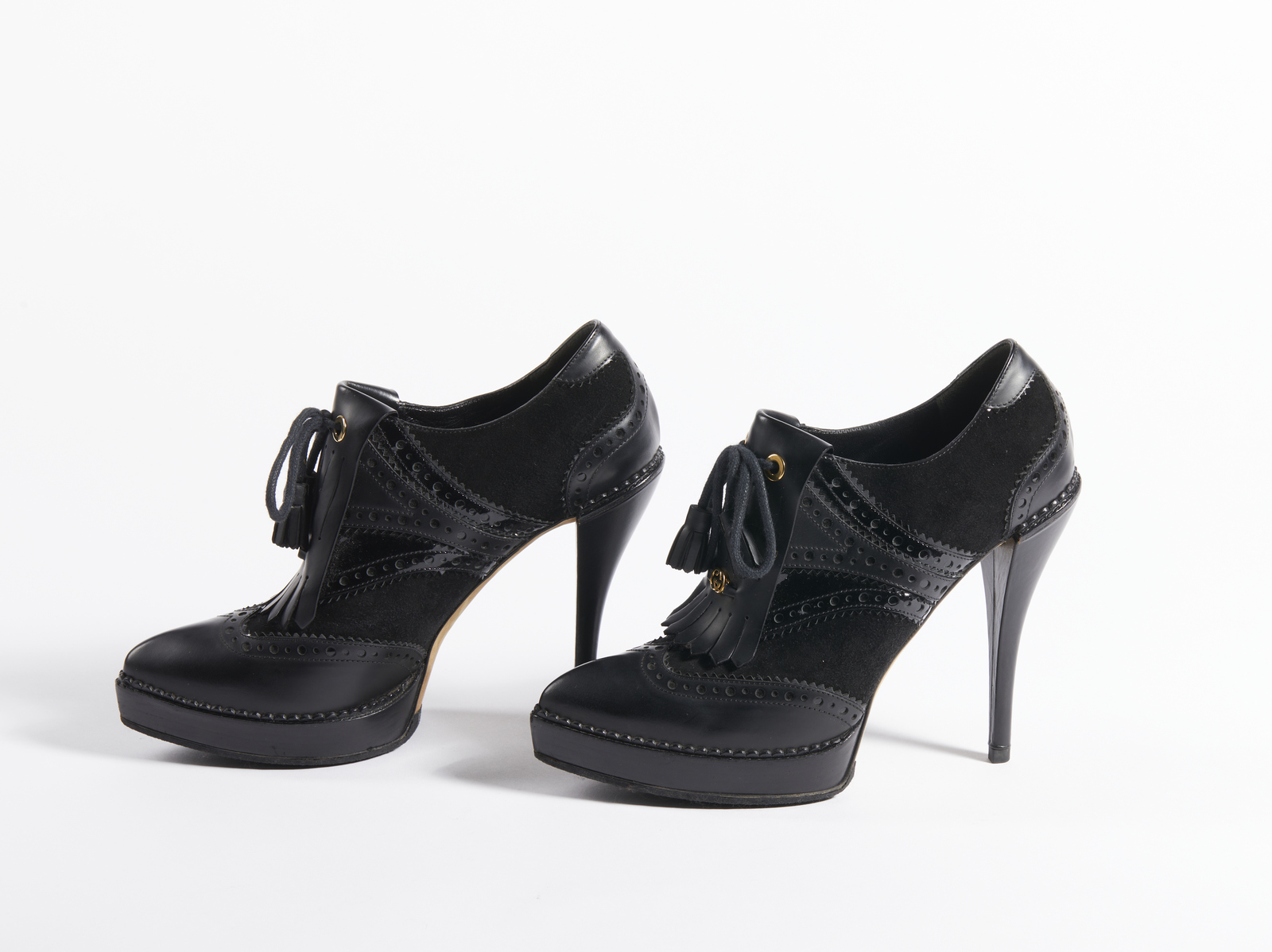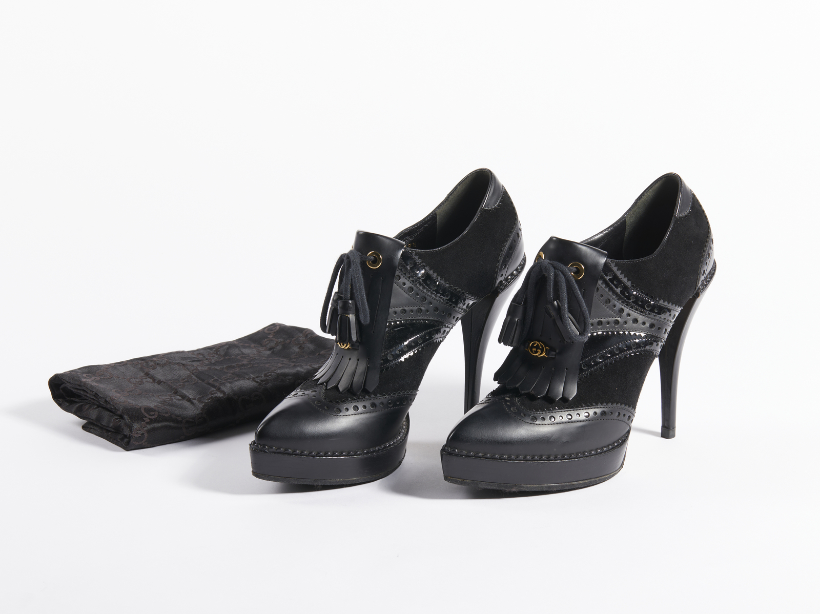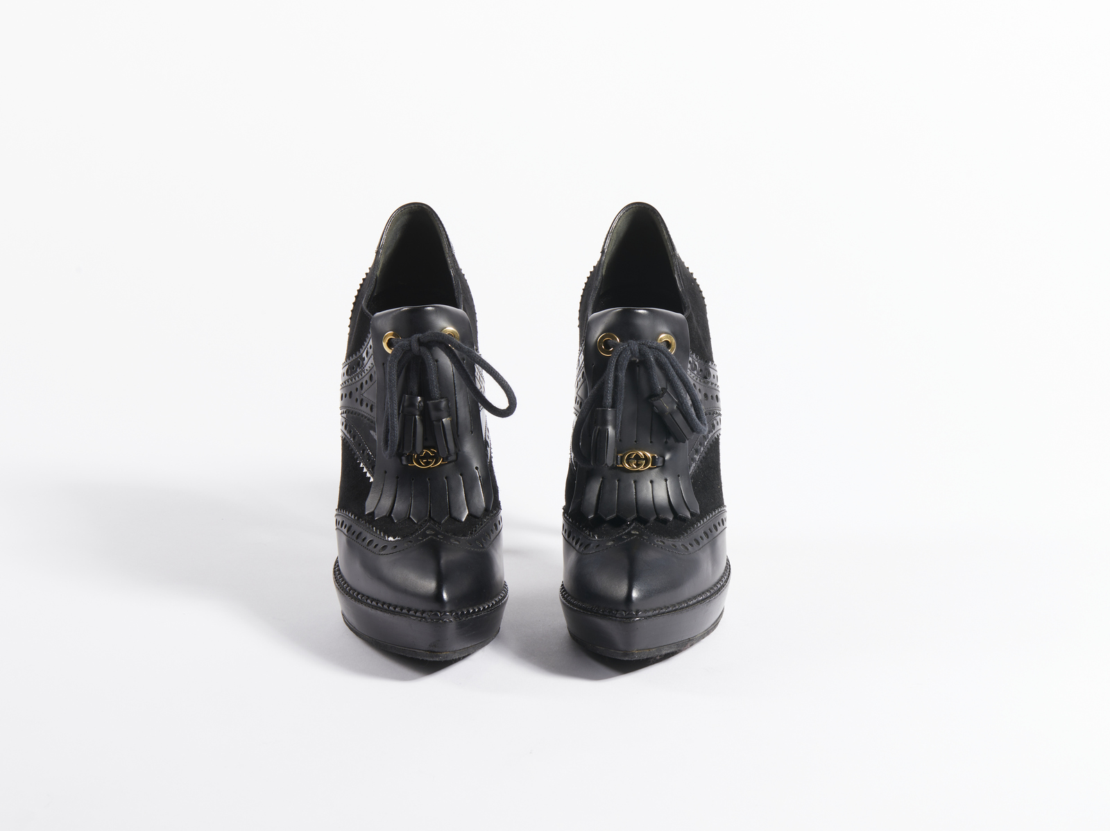 GUCCI Scarpa Francesina. Pelle e cuoio.. Cm 8,00 x 21,00. Scarpa francesina con lacci in pelle scamosciata, pelle, vernice.