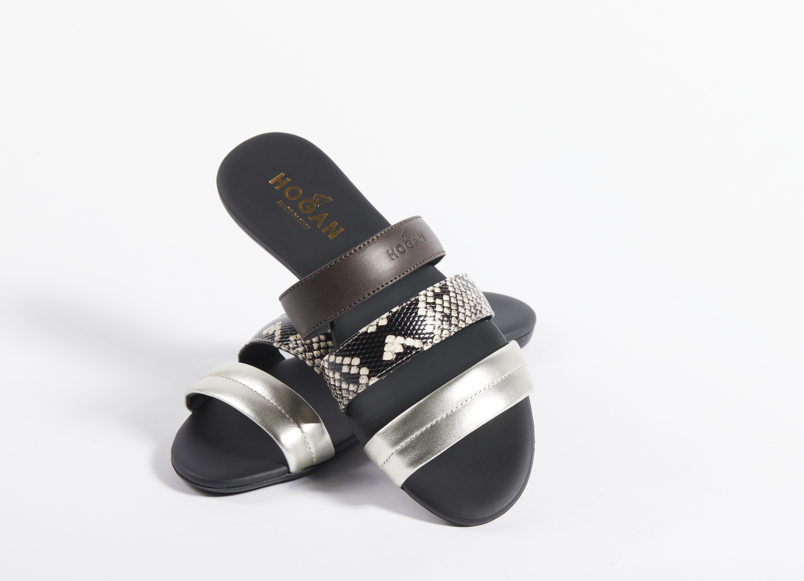 3 fasce sul collo del piede differenti: una marrone, una argentata, una stampa pitone.