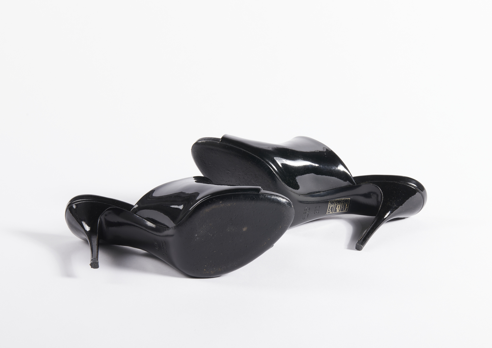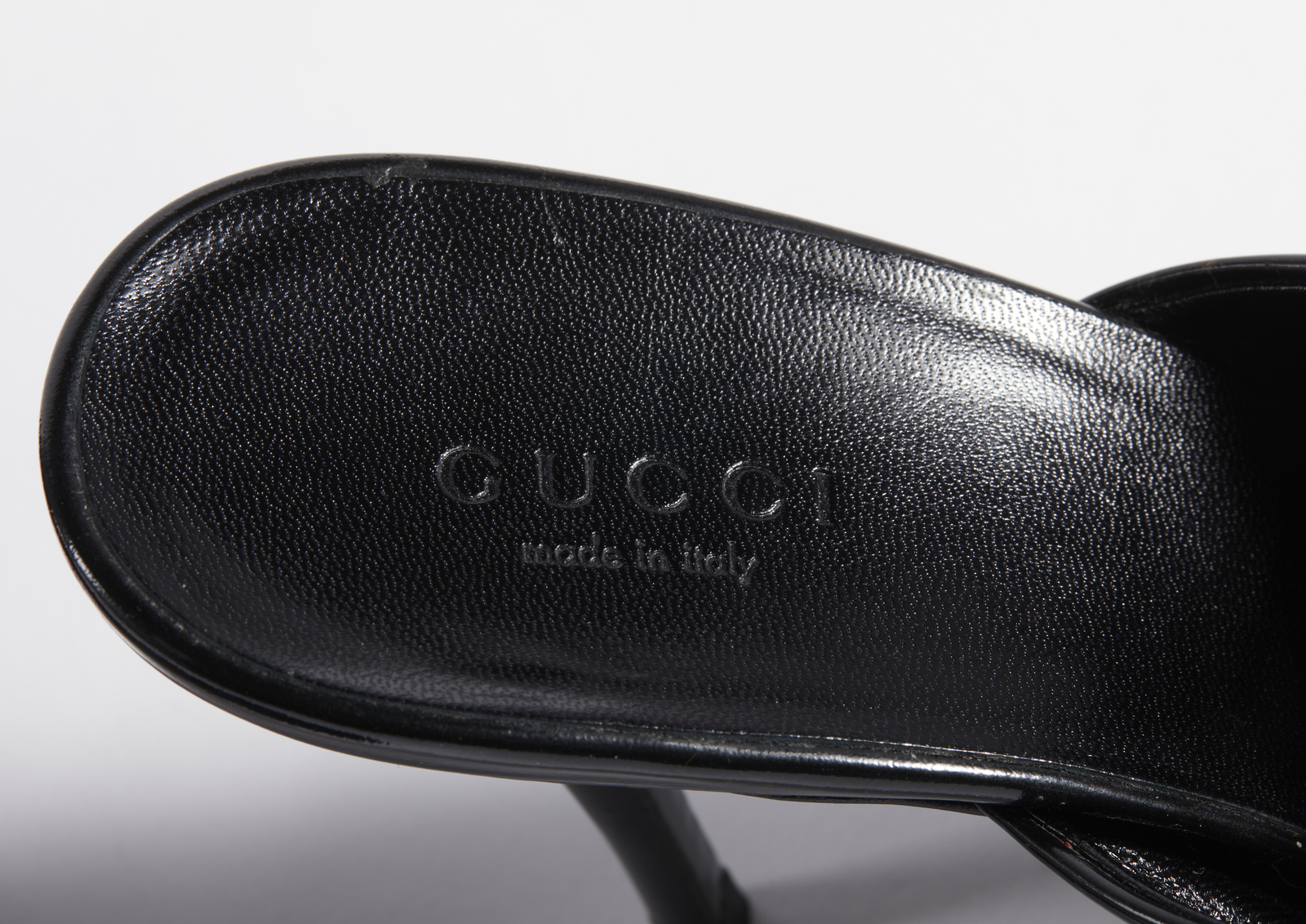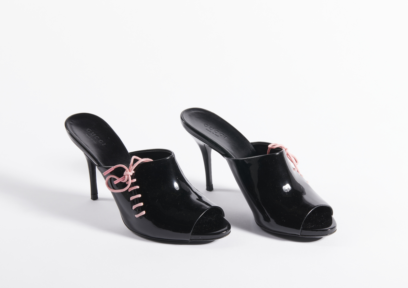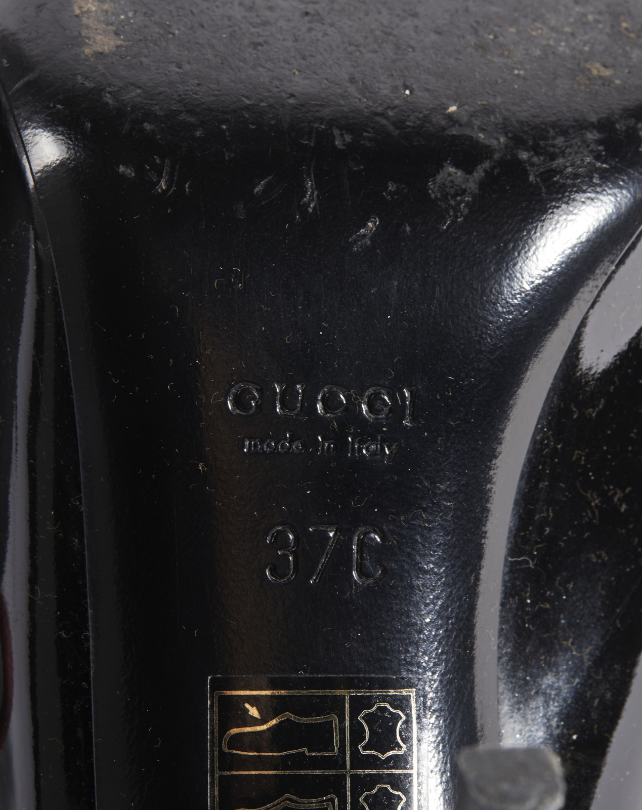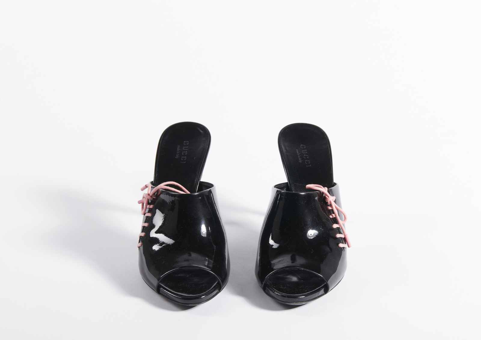 GUCCI Sandalo in vernice nera. Pelle. Cm 27,00. Scarpe peep-toe in pelle nera verniciata con dettaglio allacciatura rosa, presenta ricambio per tacchi. Taglia 37IT. Tacco 8 cm