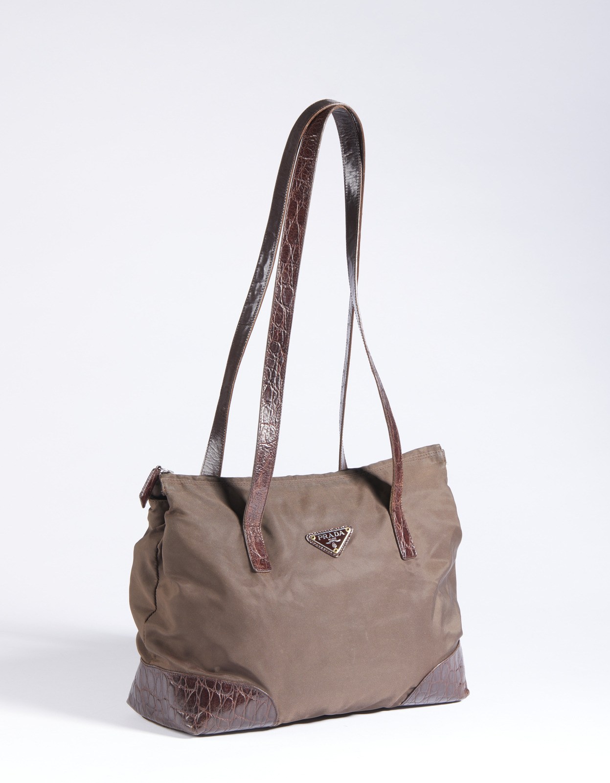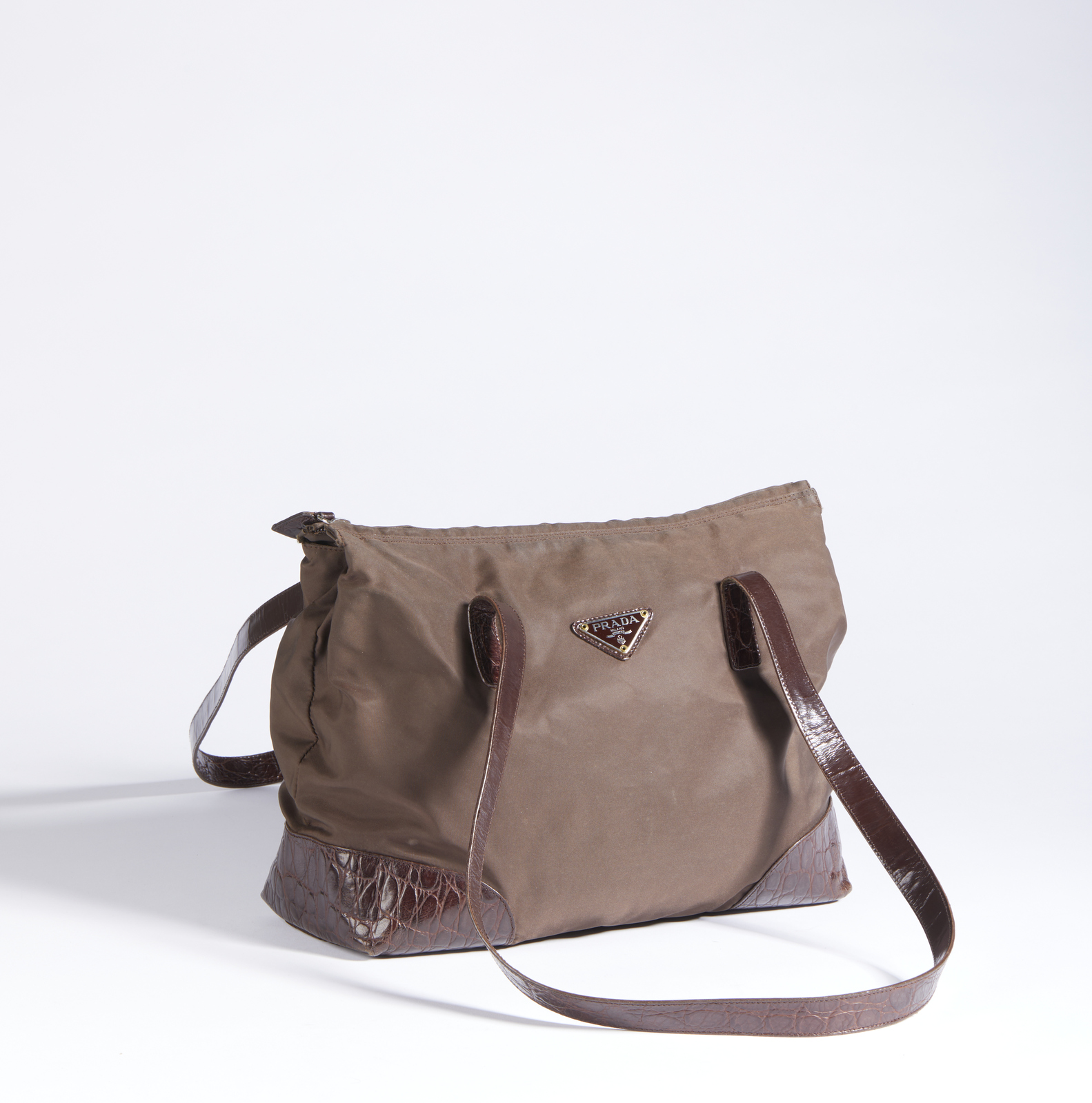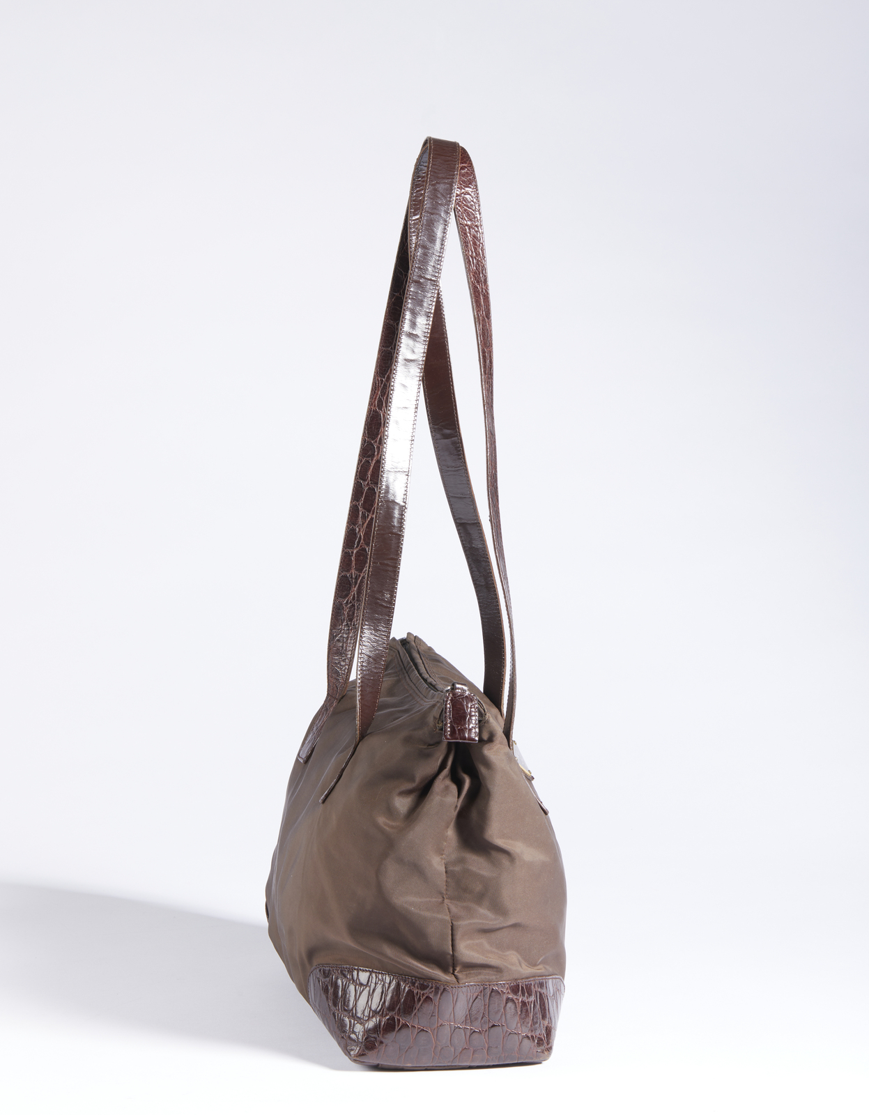 PRADA MILANO Borsa a spalla marrone in nylon e pelle. Nylon. Cm 32,00 x 22,00 x 11,00. Borsa a spalla marrone in nylon, manici in pelle, ulteriori inserti in pelle con rifiniture in simil coccodrillo, chiusura a zip e logo centrale.