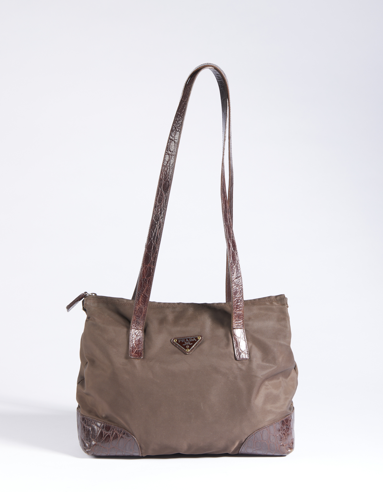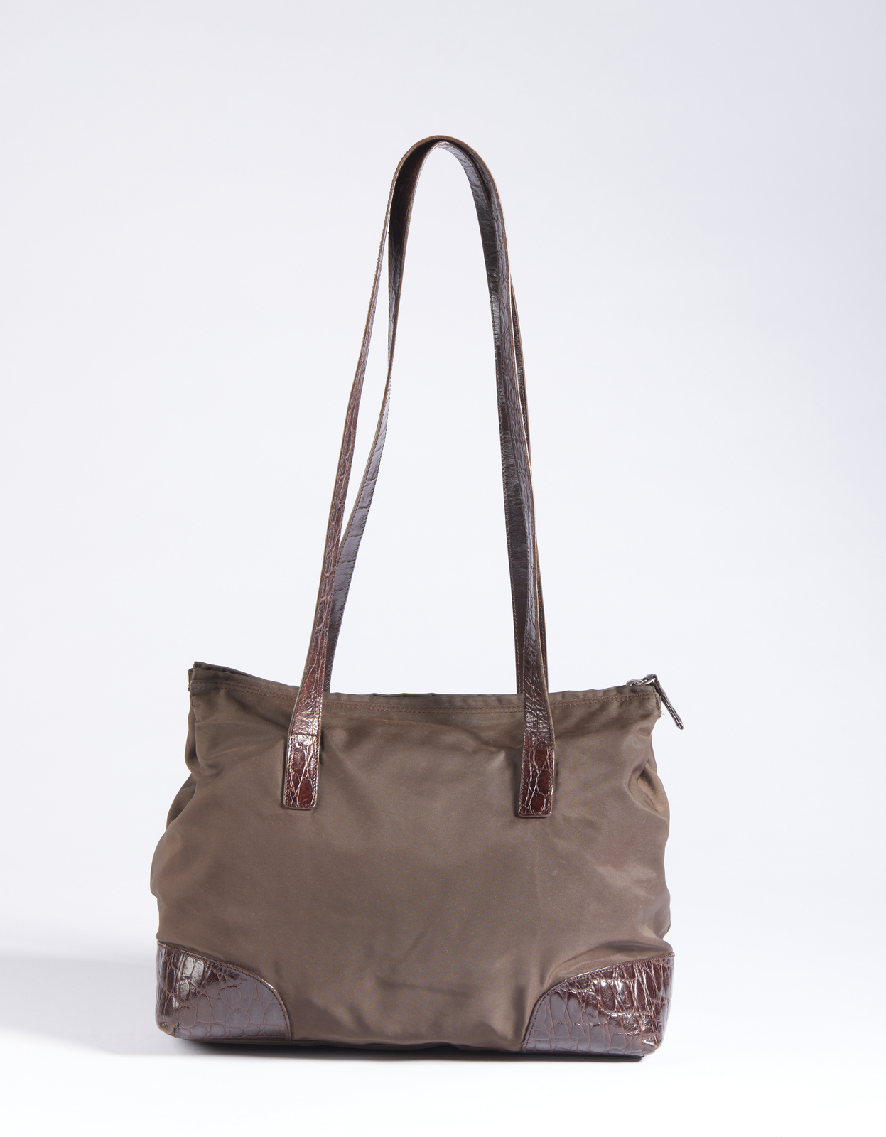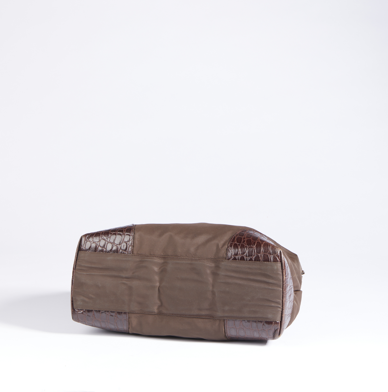 PRADA MILANO Borsa a spalla marrone in nylon e pelle. Nylon. Cm 32,00 x 22,00 x 11,00. Borsa a spalla marrone in nylon, manici in pelle, ulteriori inserti in pelle con rifiniture in simil coccodrillo, chiusura a zip e logo centrale.