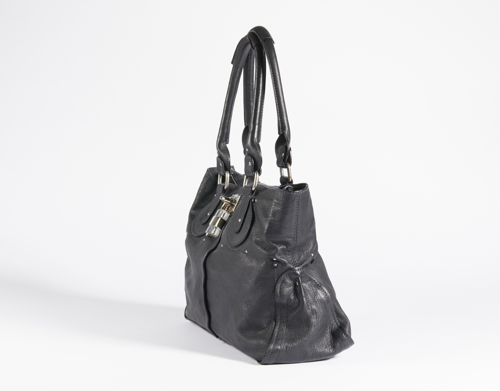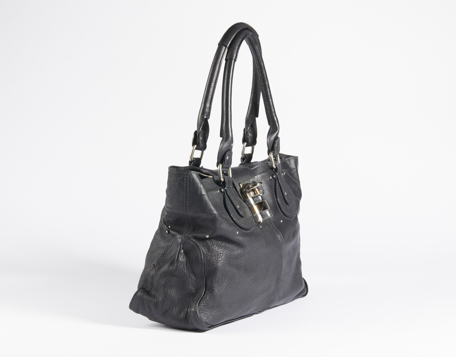 CHLOE' Borsa Chloè in pelle nera. Pelle. Cm 45,00 x 31,50 x 17,00. Borsa in pelle nera con chiusura con lucchetto. Interno in tessuto. Sono presenti due grandi tasche interno con chiusura con lampo. A chiusura della borsa è presente un lucchetto e la sua chiave.