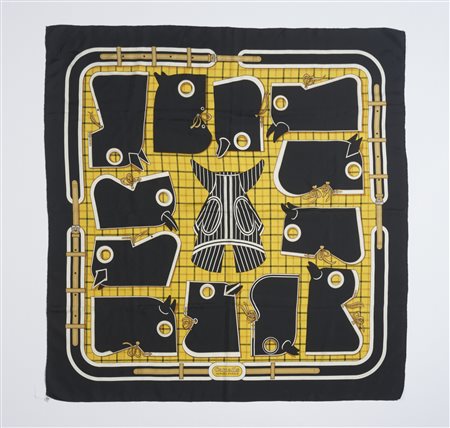 HERMES Foulard collezione Camails. . Seta. Cm 87,00 x 90,00. Foulard collezione Camails pura seta. Finemente decorato nei colori nero, giallo e bianco.