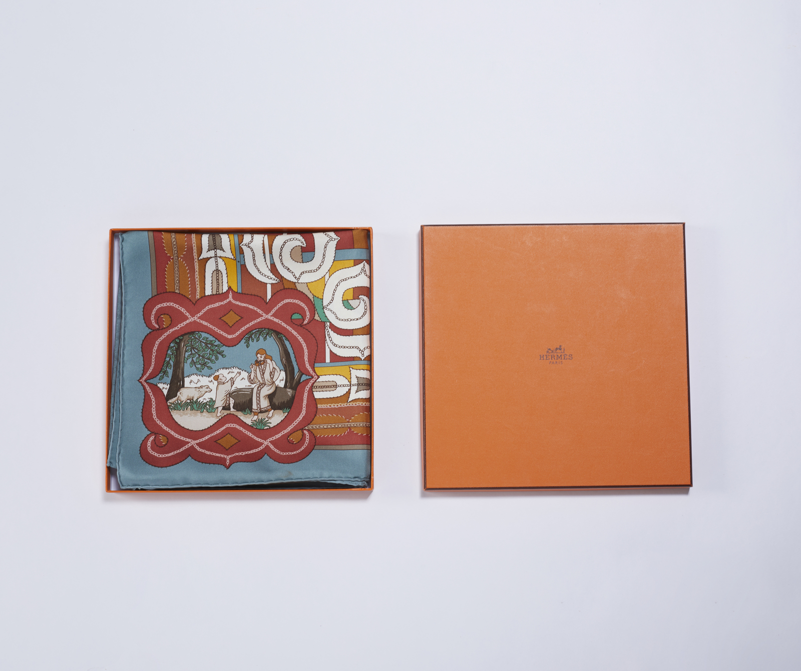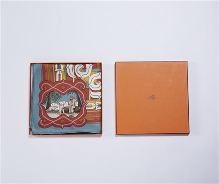 HERMES Foulard "Esprit ainou" . Seta. Cm 90,00 x 90,00. Foulard "Esprit ainou" nei toni del marrone, azzurro e ocra. Annodato a mano. Disegnato nel 2011 da Natsuno Hidaka; presenta un motivo caleidoscopico astratto con scene del popolo indigeno Ainu del Giappone.