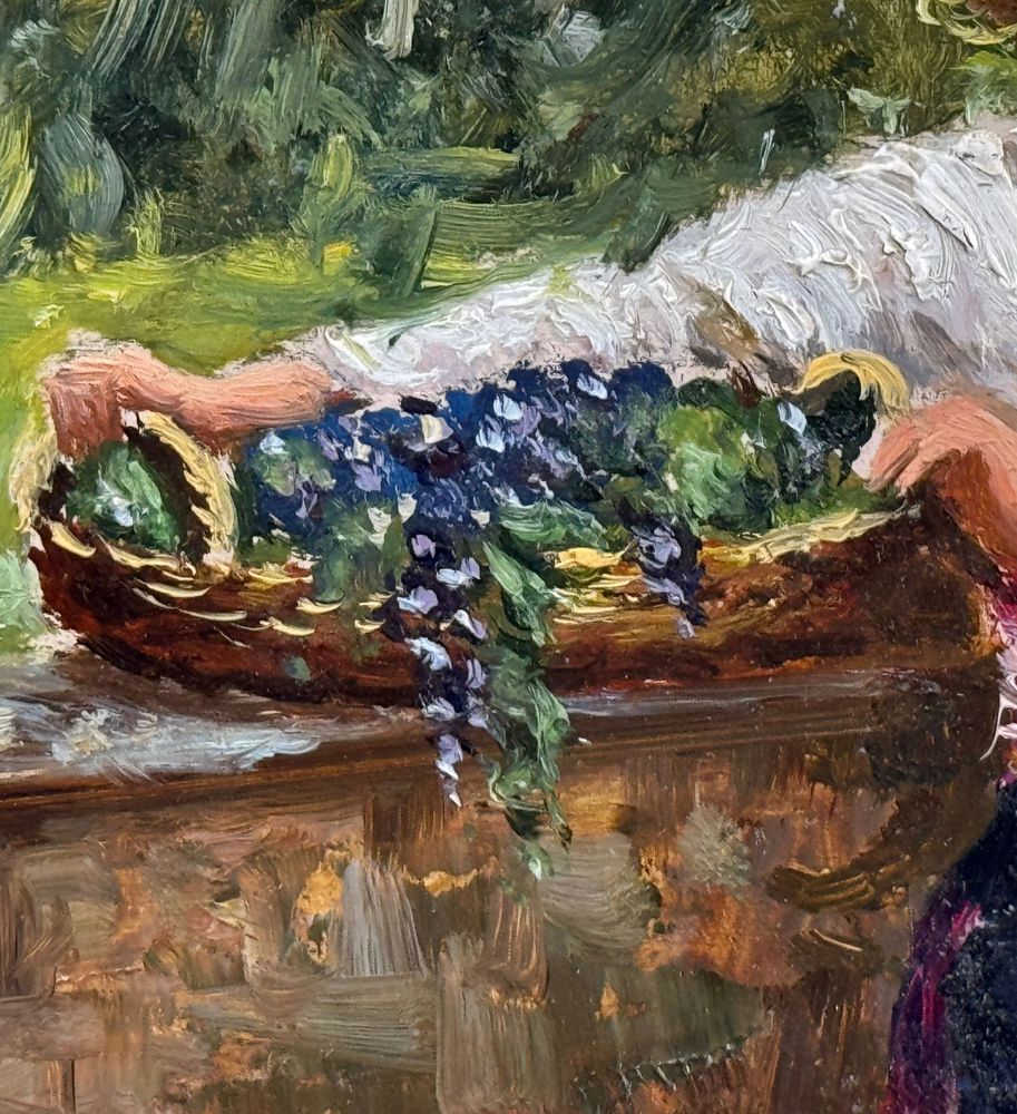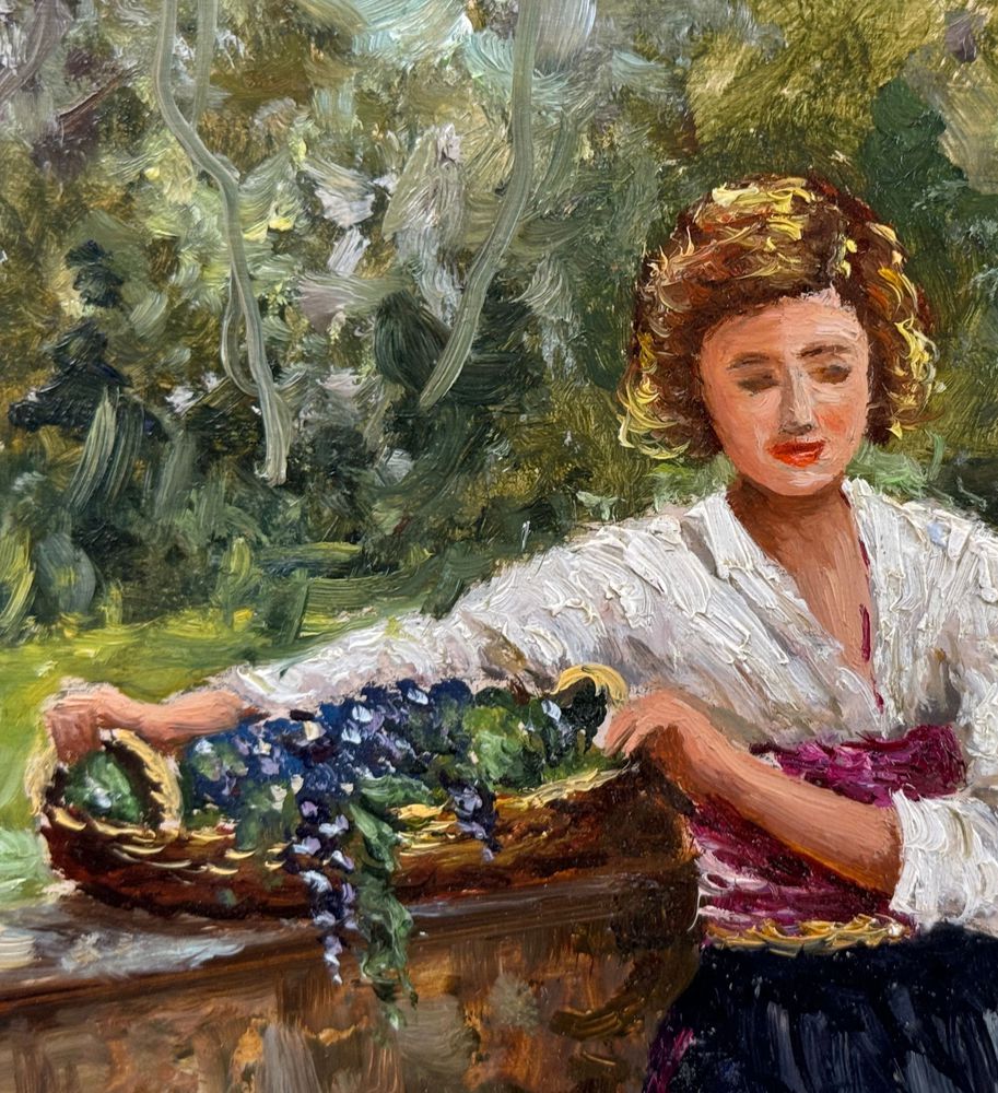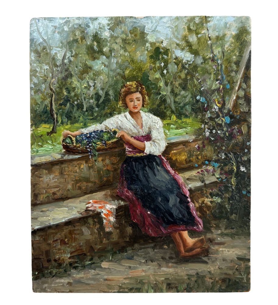 Dipinto olio su tavola, periodo primi anni del XX secolo, scuola Italiana, raffigurante La venditrice di frutta. Dimensioni: 24x30 cm. Da artista anonimo. Opera in buone condizioni.