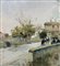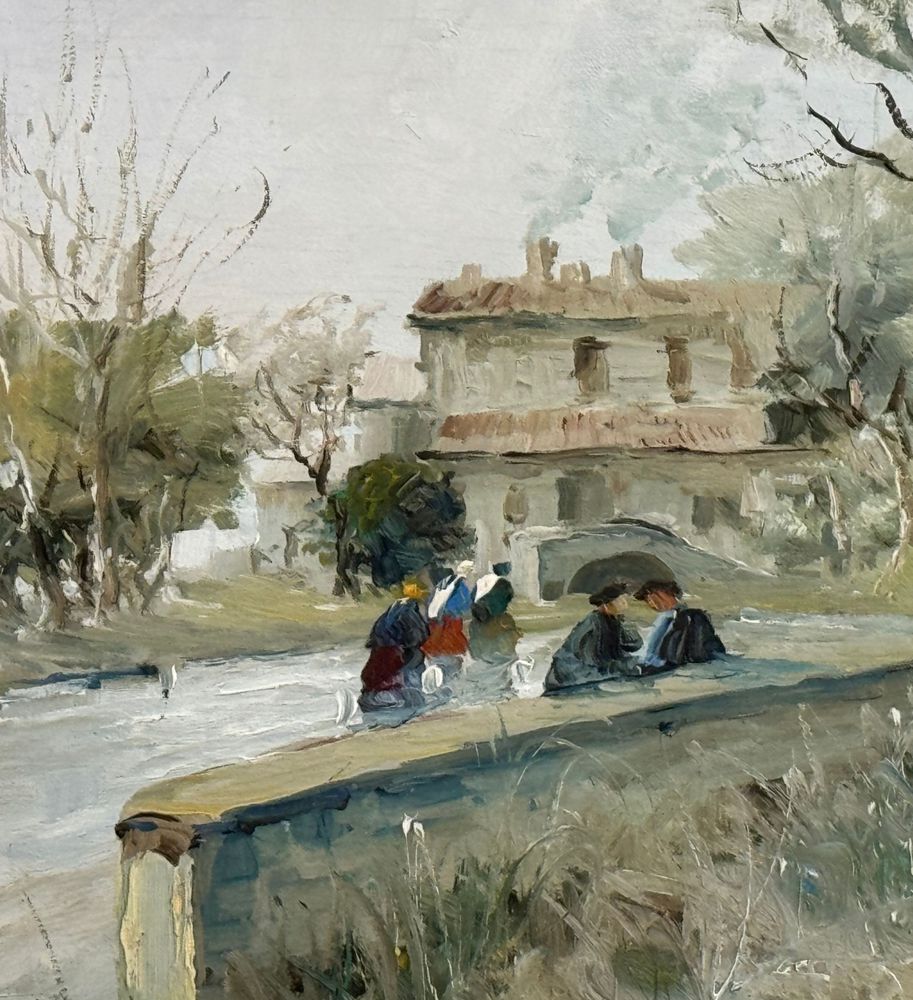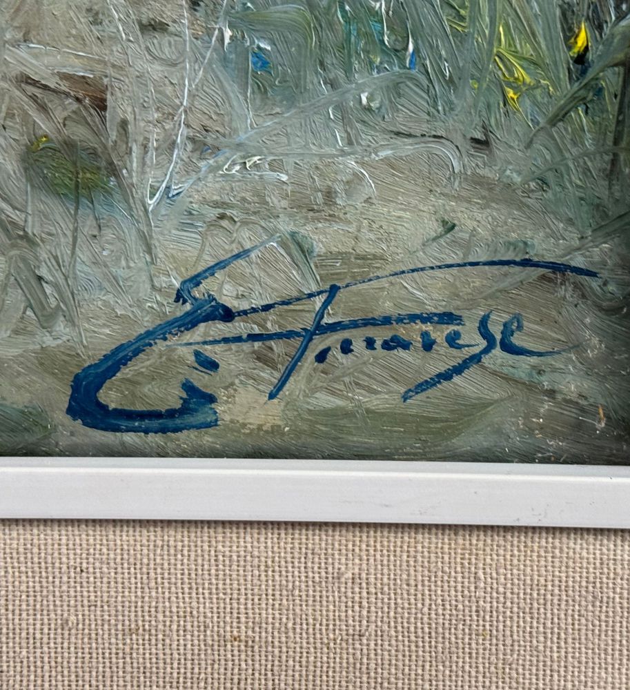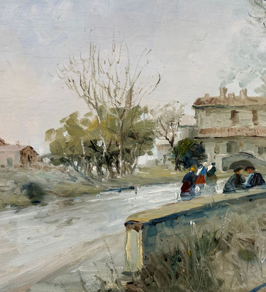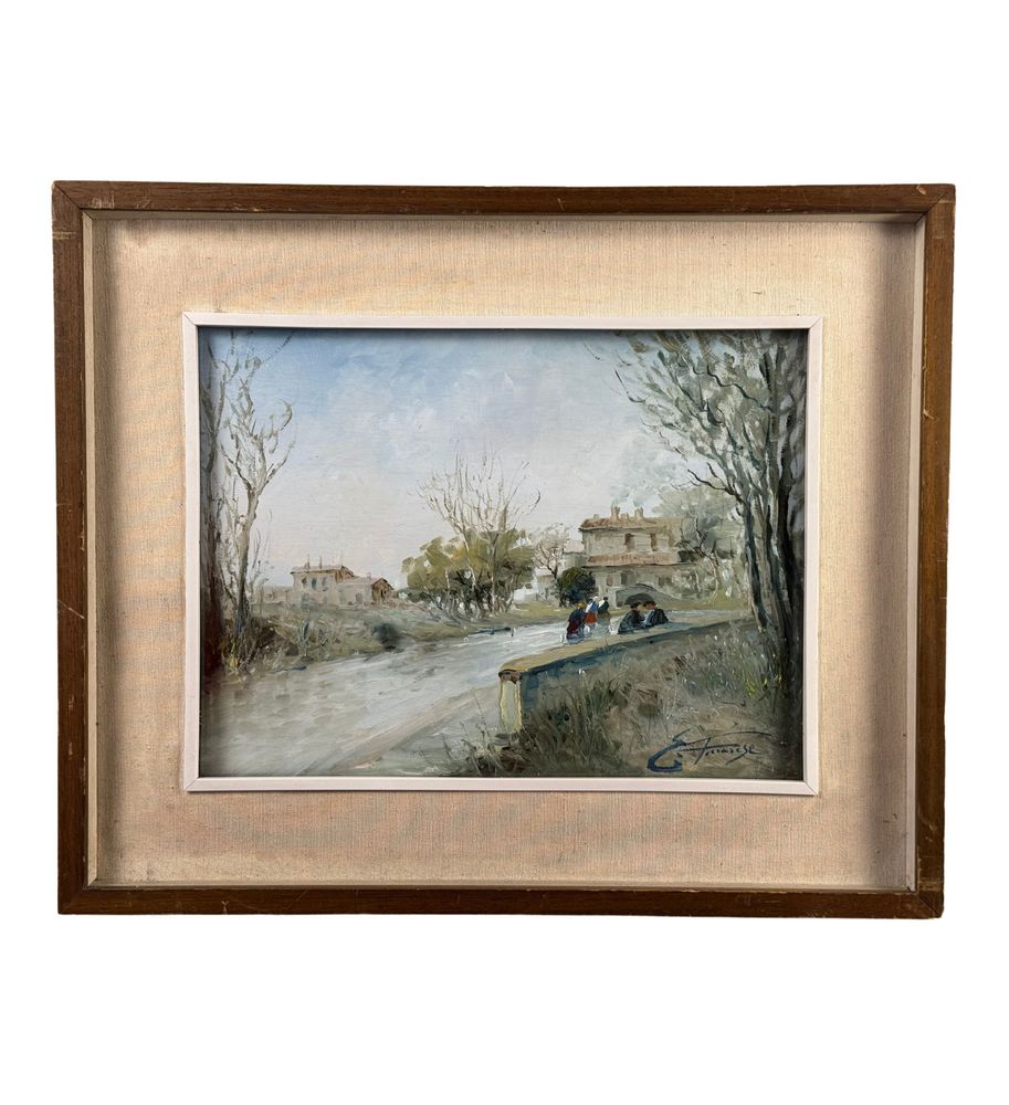 Dipinto olio su tavola, periodo XX secolo scuola Italiana, raffigurante Paesaggio con personaggi. Dimensioni compreso cornice: 55x45 cm. Dimensioni interno cornice: 30x40 cm. Reca firma in basso a destra da E. Ferrarese. Opera in buone condizioni.