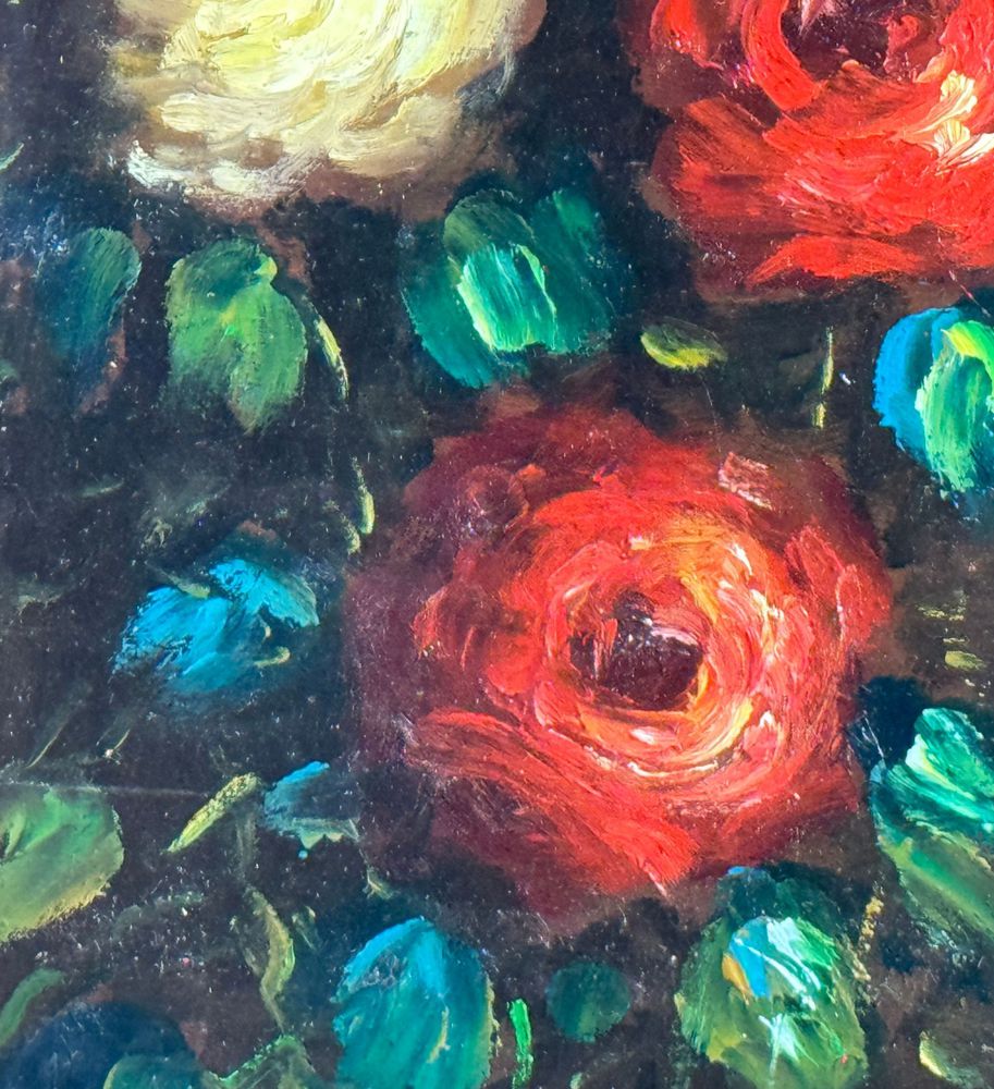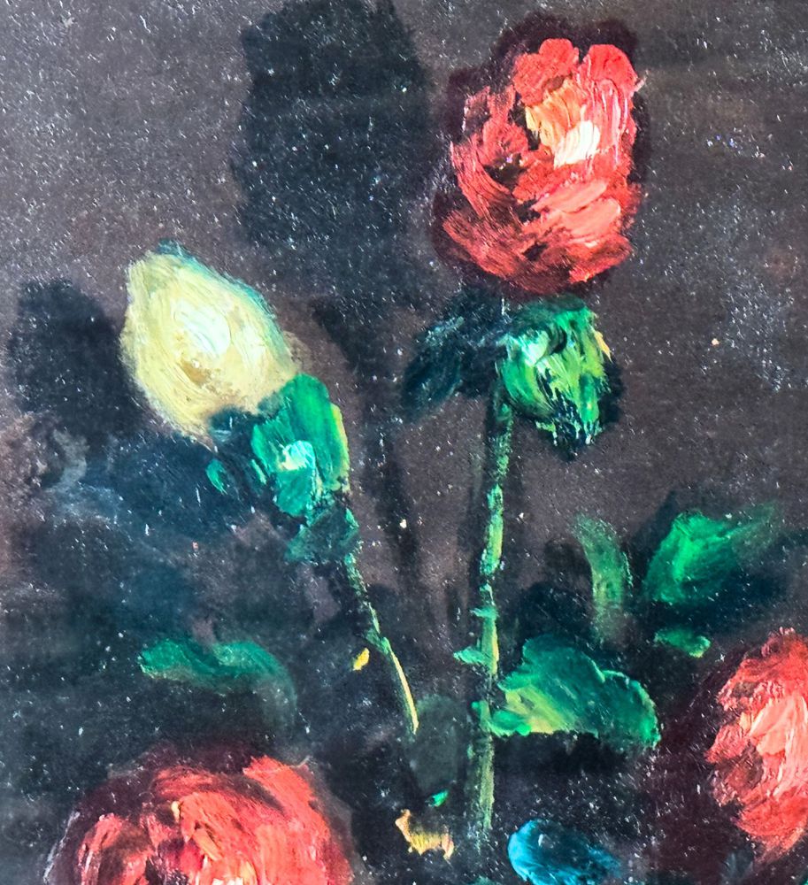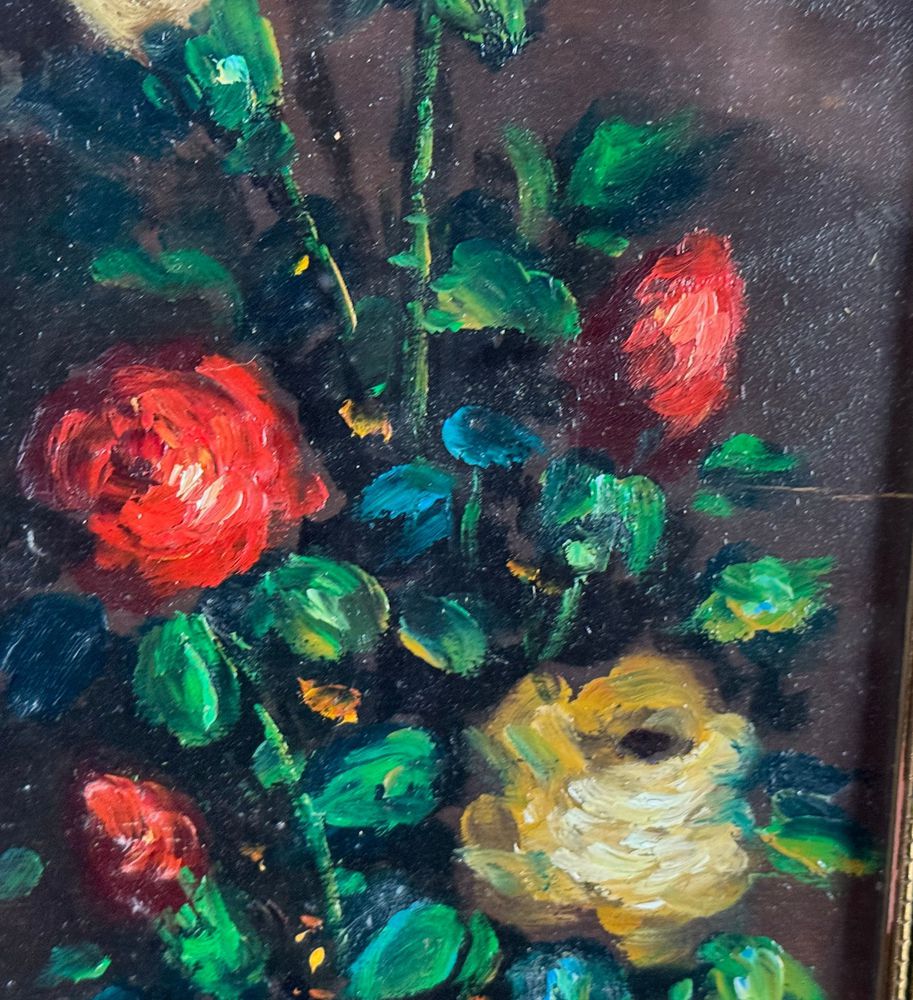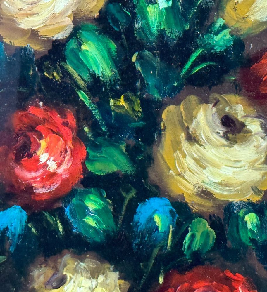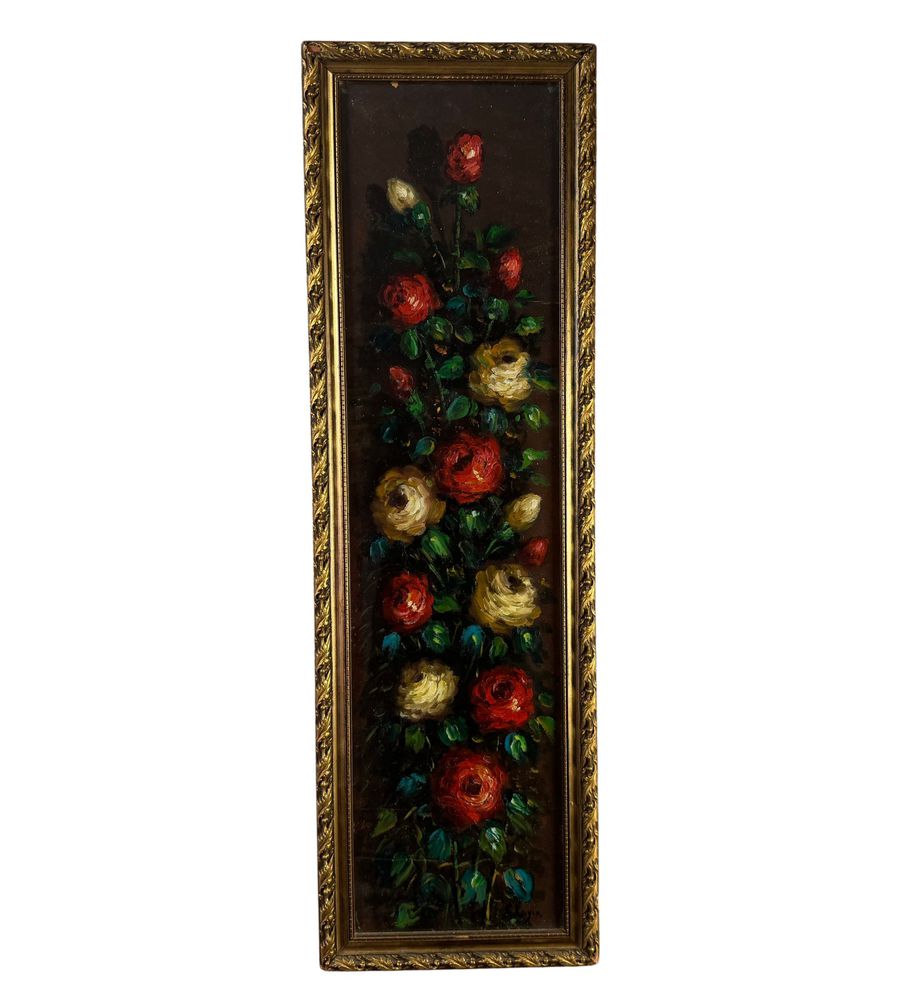 Dipinto olio su pannello, periodo prima metà del XX secolo scuola Italiana, raffigurante Composizione di fiori. Dimensioni compreso cornice: 87x27 cm. Dimensioni interno cornice: 85x25 cm. Reca firma in basso a destra da artista non identificato. Opera in buone condizioni.