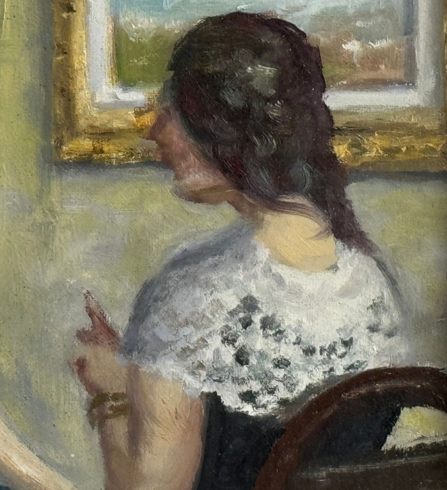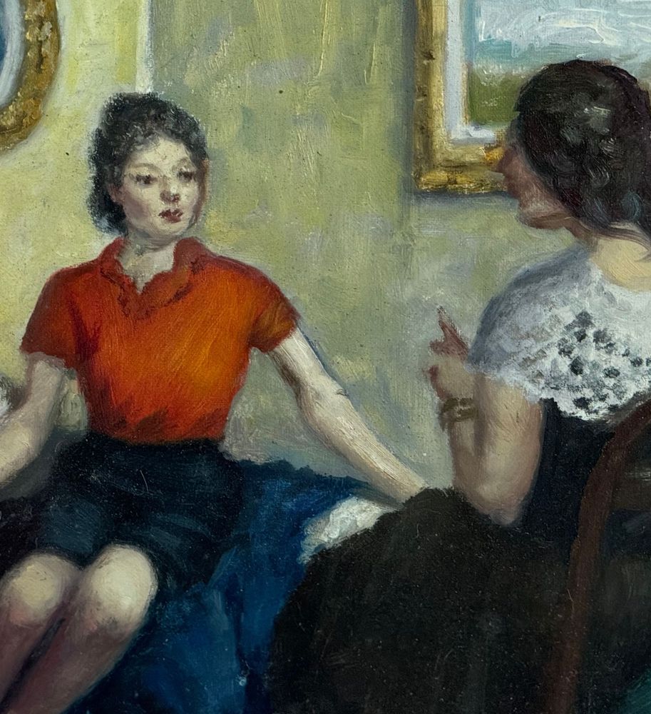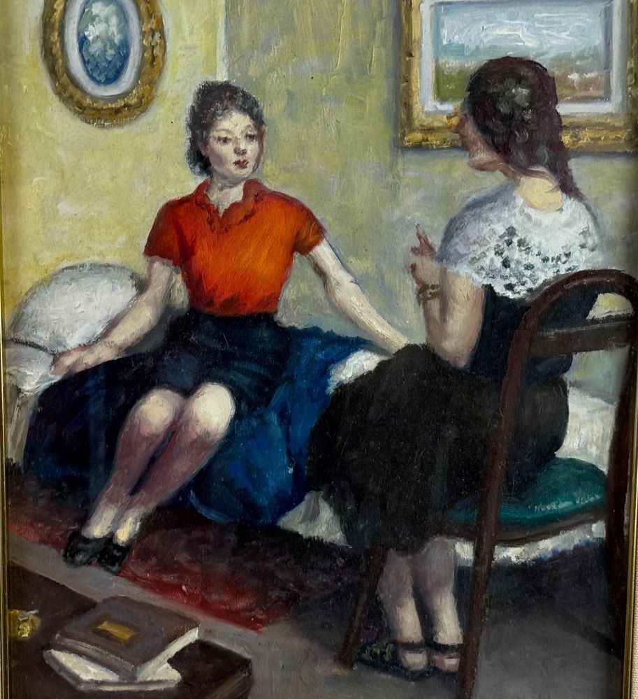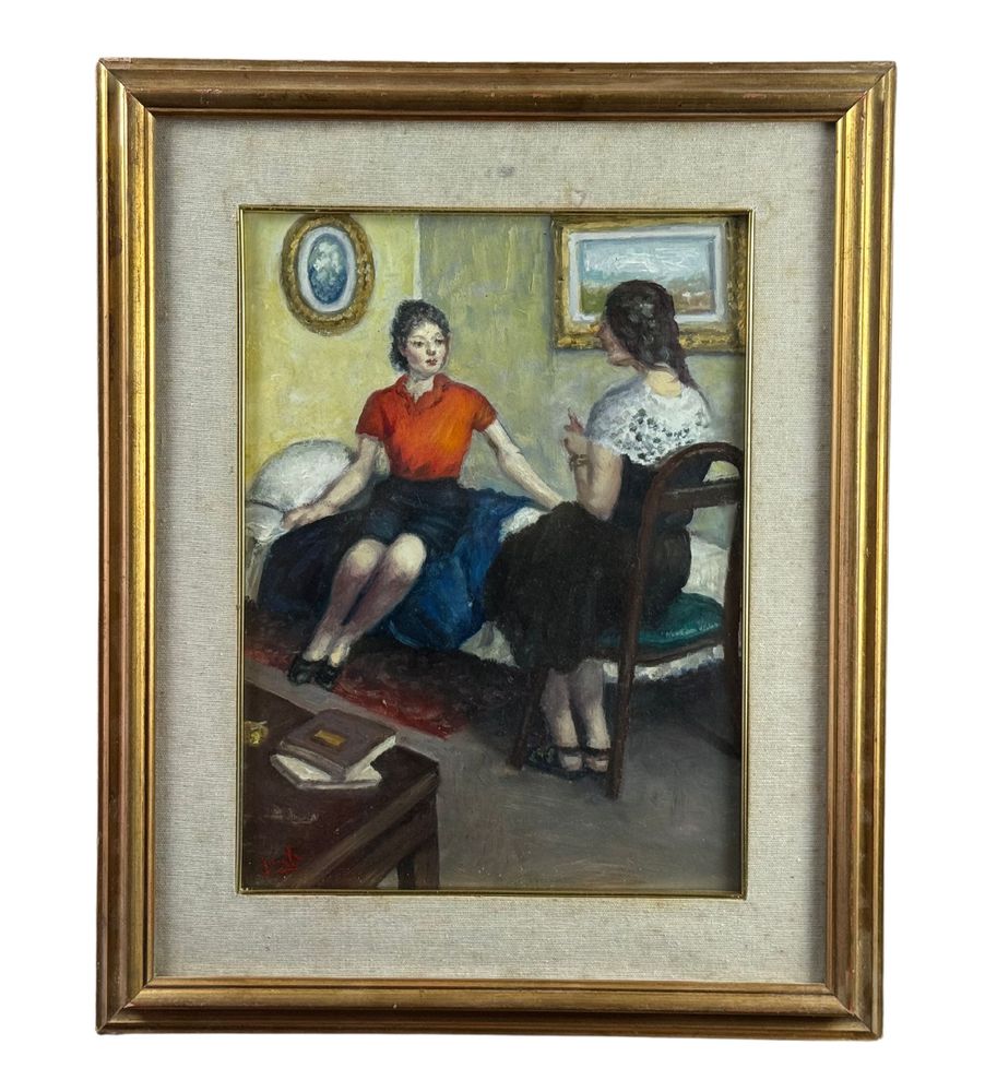 Dipinto olio su tela applicata su pannello, periodo prima metà del XX secolo scuola Europea, raffigurante Due donne in un interno. Dimensioni compreso cornice: 45x56 cm. Dimensioni interno cornice: 30x40 cm. Reca firma in basso a sinistra da artista non identificato. Opera in buone condizioni.