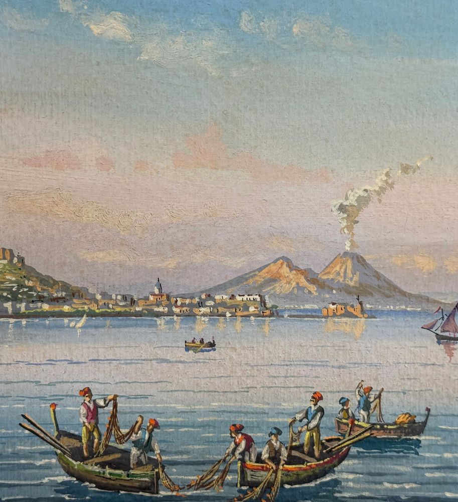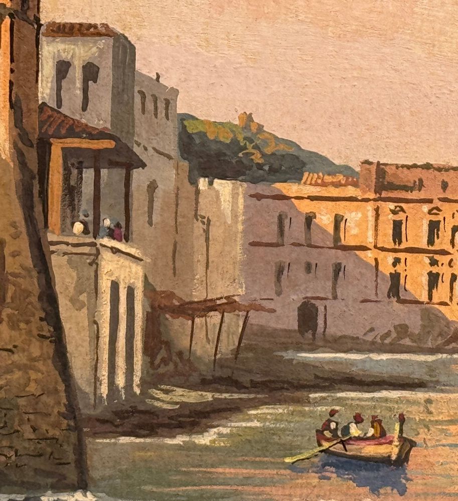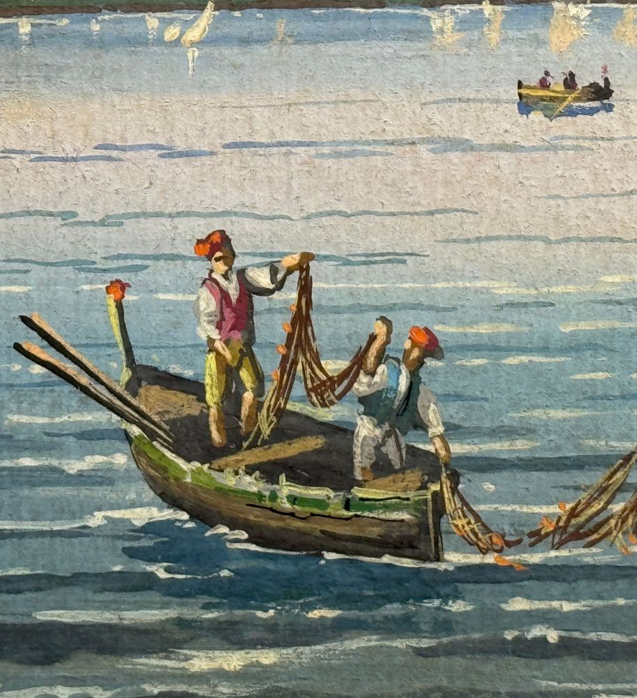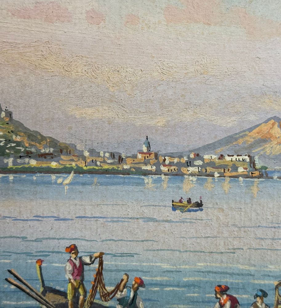 Dipinto guazzo (tempera su carta), periodo prima metà del XX secolo scuola italiana, raffigurante Pescatori a Posillipo. Dimensioni: 45x29 cm. Reca firma in basso a destra da Gianni. Opera in buone condizioni con lievi segni di vissuto come da foto allegate.
