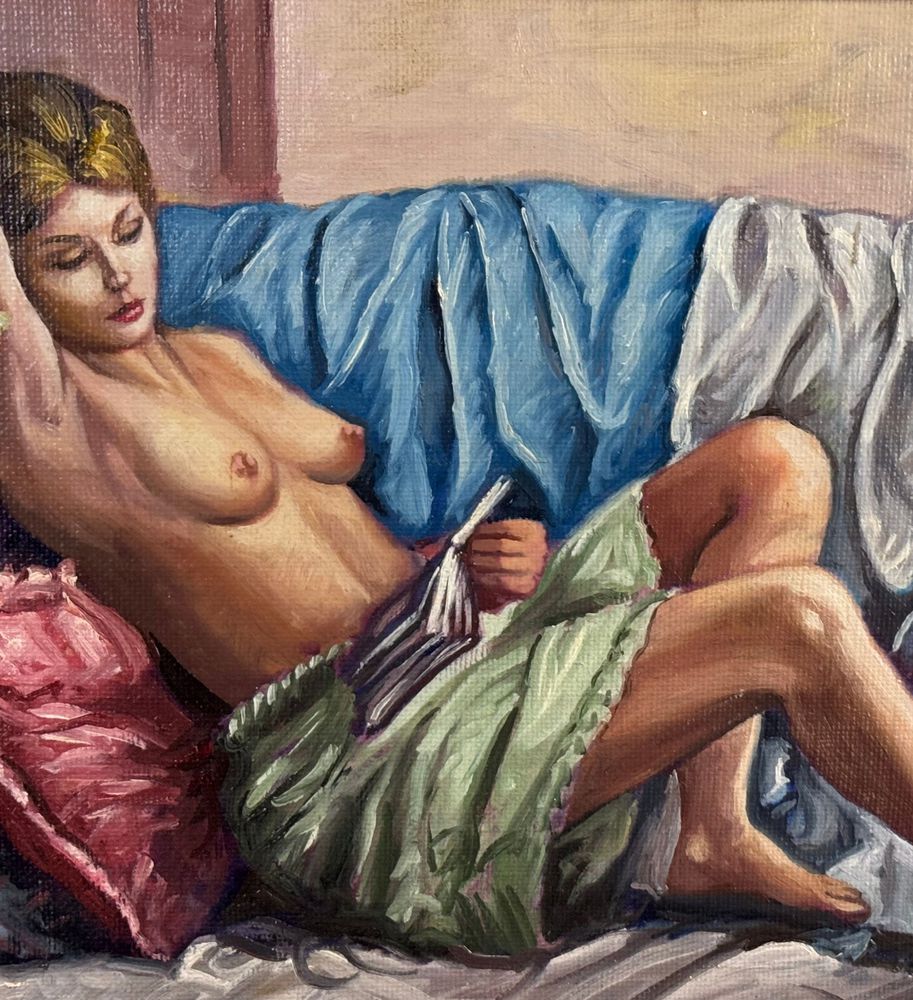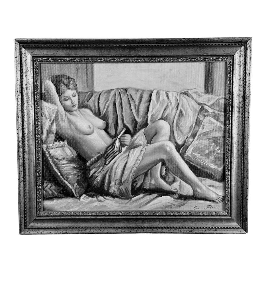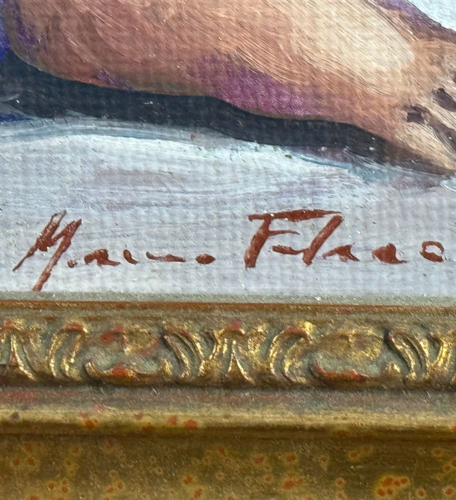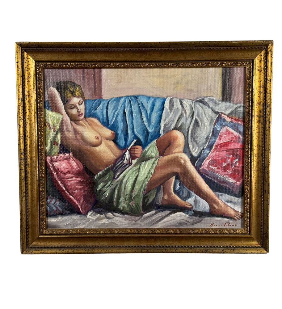 Dipinto olio su tela applicata su pannello, periodo XX secolo scuola italiana, raffigurante Nudo di donna in lettura. Dimensioni compreso cornice: 49x58 cm. Dimensioni interno cornice: 47x38,5 cm. Reca firma in basso a destra da Marino Faliero. Opera in buone condizioni e di ottima qualità artistica.