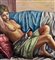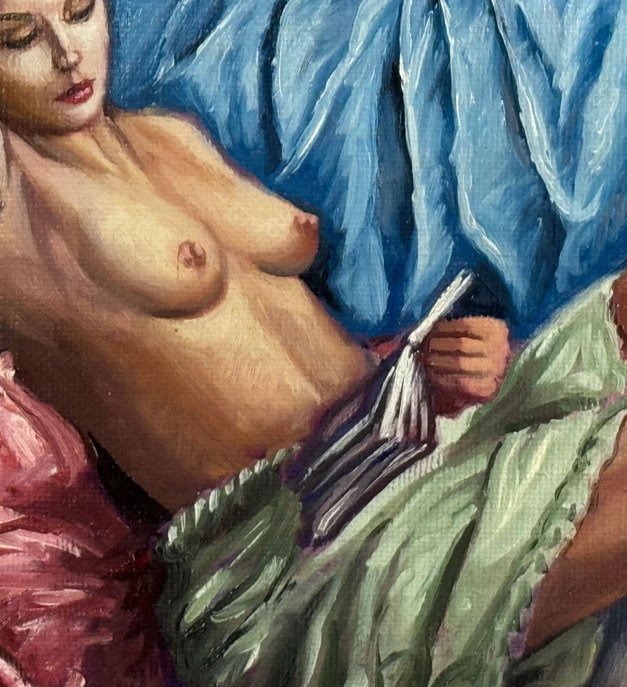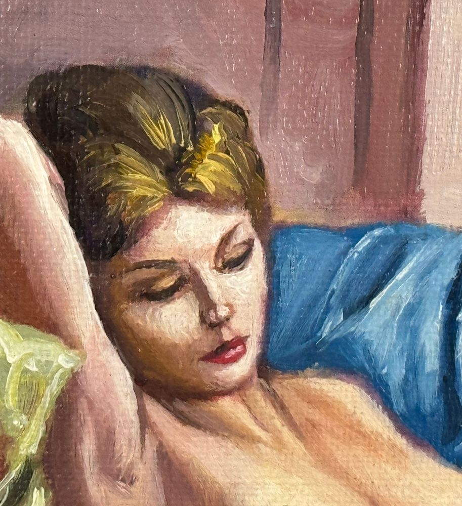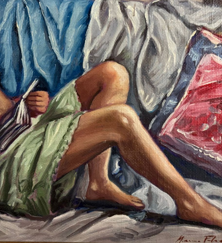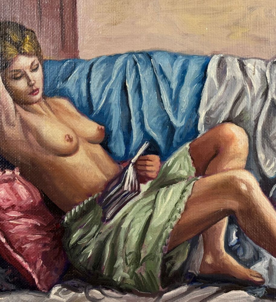 Dipinto olio su tela applicata su pannello, periodo XX secolo scuola italiana, raffigurante Nudo di donna in lettura. Dimensioni compreso cornice: 49x58 cm. Dimensioni interno cornice: 47x38,5 cm. Reca firma in basso a destra da Marino Faliero. Opera in buone condizioni e di ottima qualità artistica.