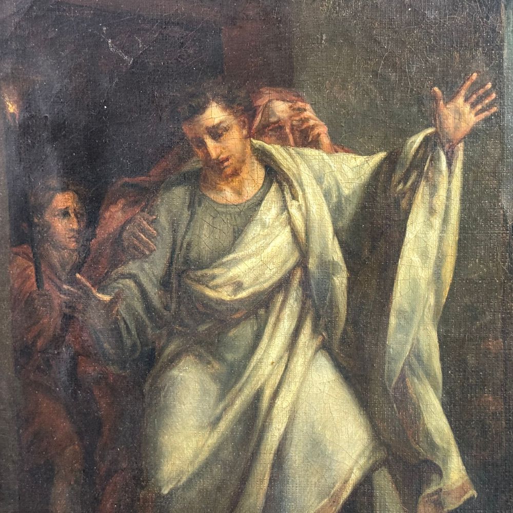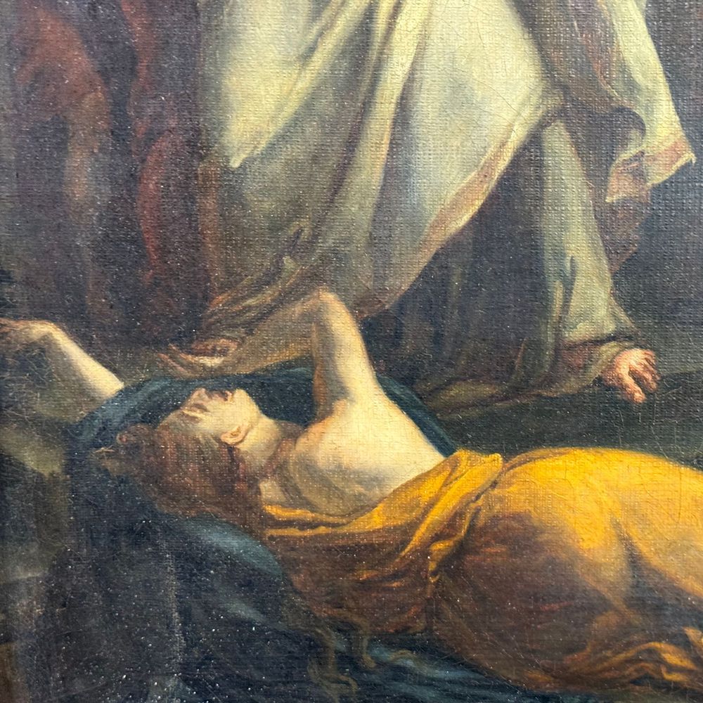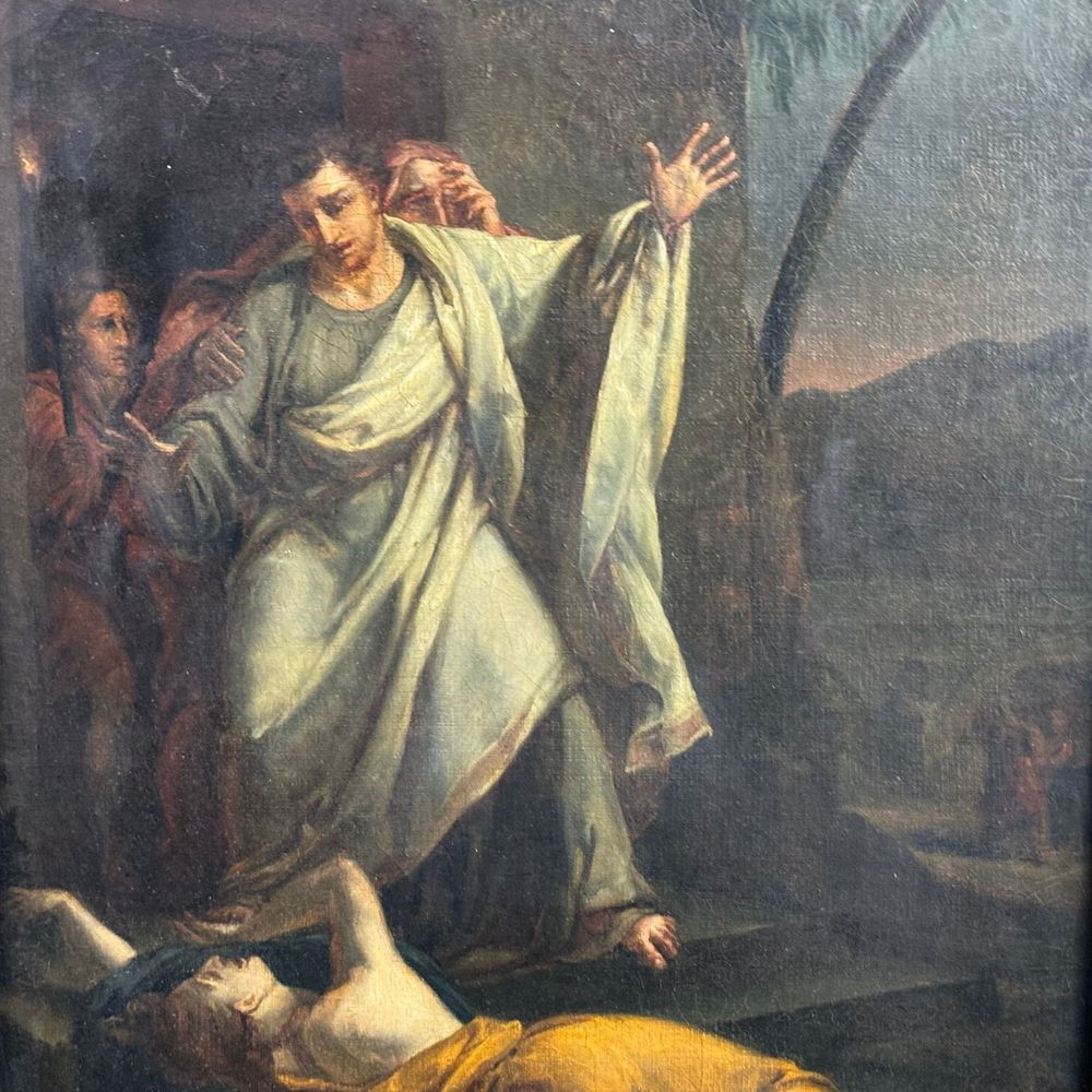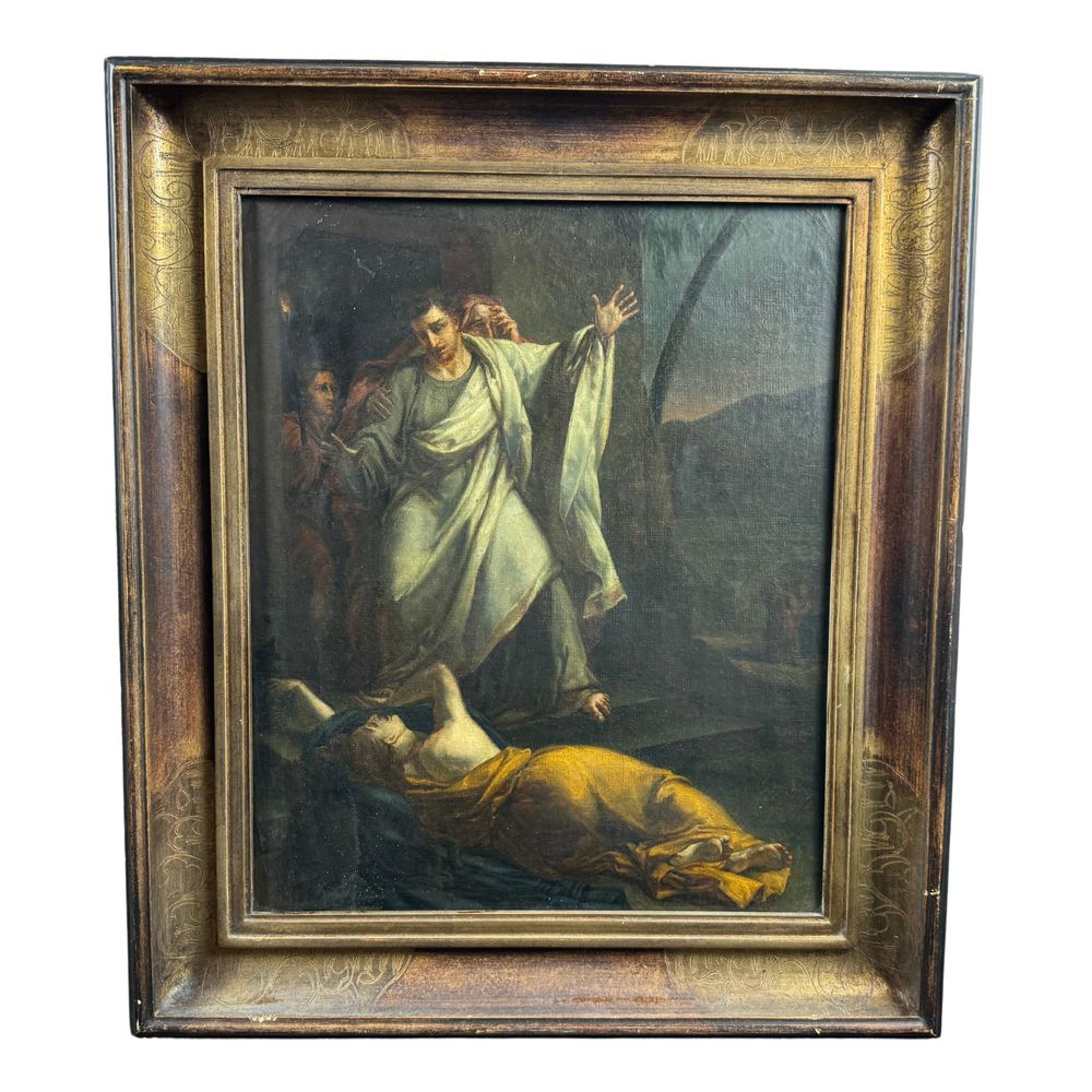 Dipinto olio su tela, periodo inizio XX secolo scuola Francese, copia d'autore da Louis Charles Auguste Couder (1790-1873), raffigurante Le Lévite d'Ephraim. Dimensioni interno cornice: 39x46 cm . Da artista anonimo.