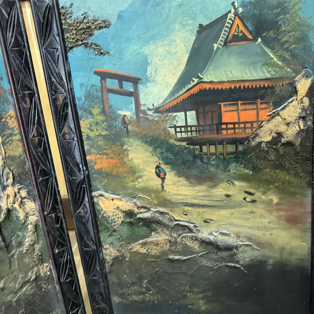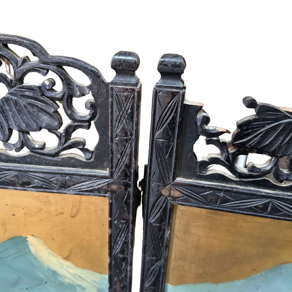 Separè in legno ebanizzato e traforato, con pannelli decorati a mano, raffiguranti Scenari Orientali. Periodo XX secolo. Dimensioni totali: 117x95 cm. Presenta lievi segni di vissuto ai pannelli decorativi e alcune mancanze sul telaio ebanizzato e traforato.
