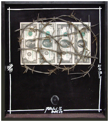 PETER HIDE 311065 (Franco Crugnola) Tradate 1965 Border line 2013 T.m. e banconote su tavola con filo spinato e cornice dipinta 43 x 38,5 x 4. Firma e data in b. al c. + data al c. a s. e a d. + sul lato sx in b.; sul verso titolo, firma, data e timbro dell’artista (tutti ripetuti varie volte). Autentica dell’autore su foto.