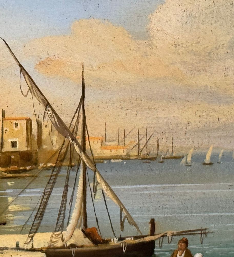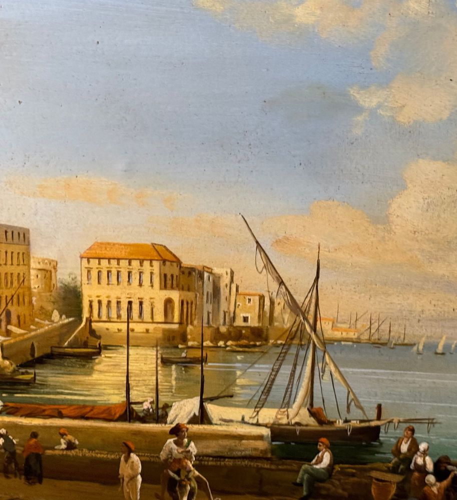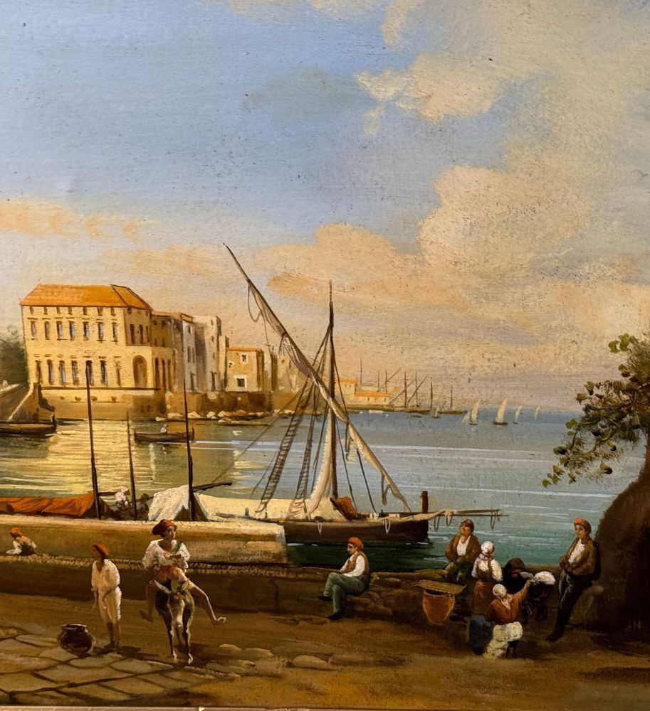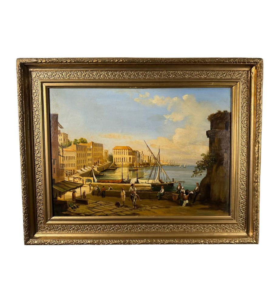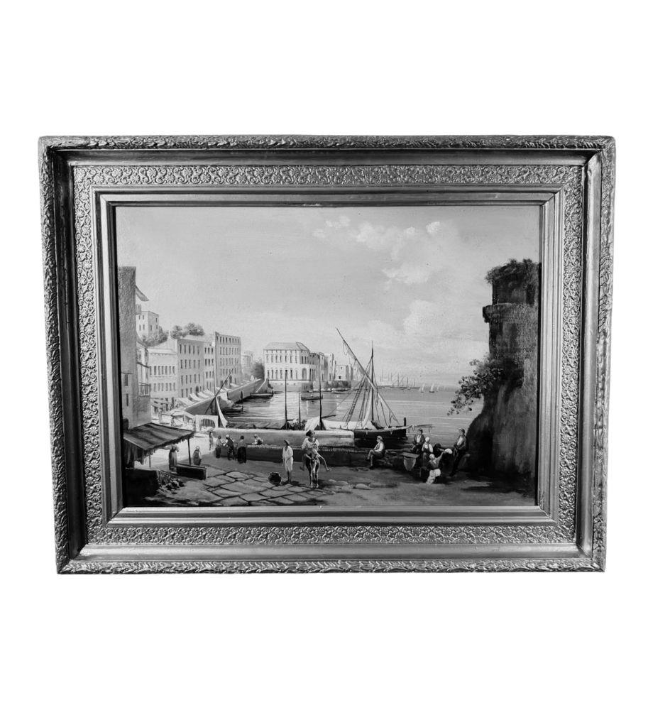 Dipinto olio su tavola, periodo XX secolo scuola italiana, raffigurante Città portuale. Dimensioni compreso cornice: 89x69 cm. Dimensioni interno cornice: 70x50 cm. Da artista anonimo. Opera in buone condizioni.