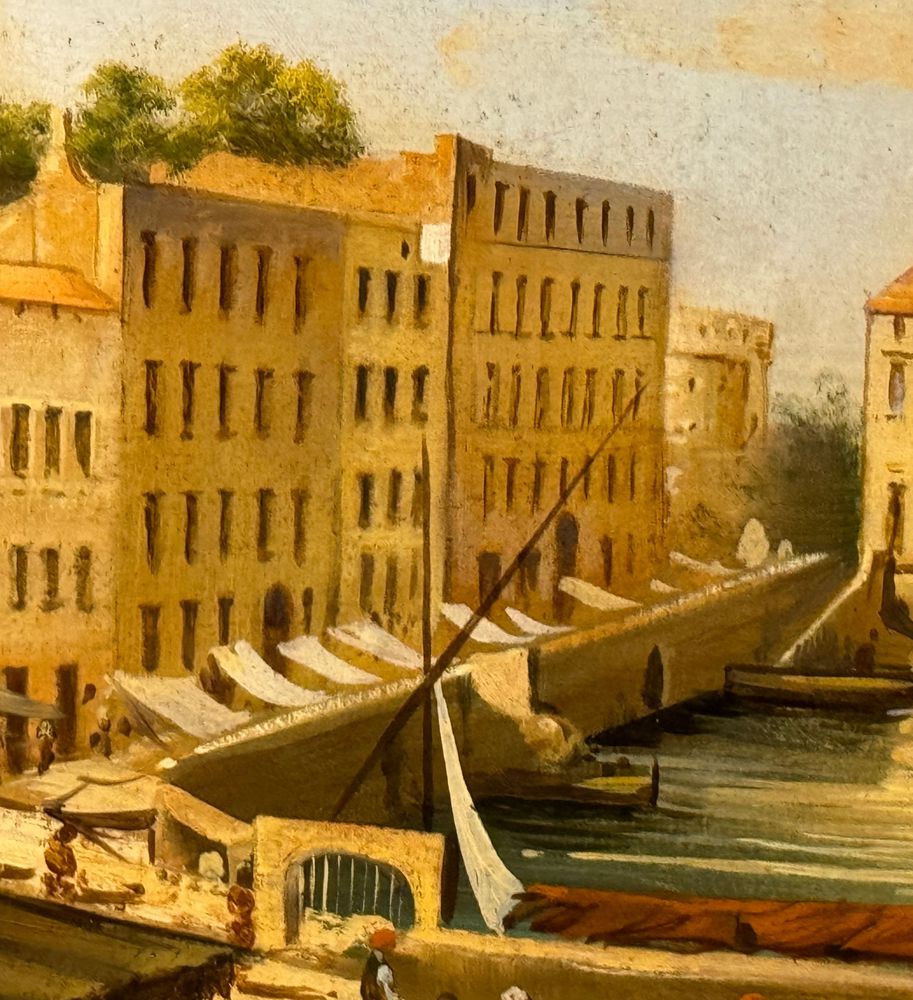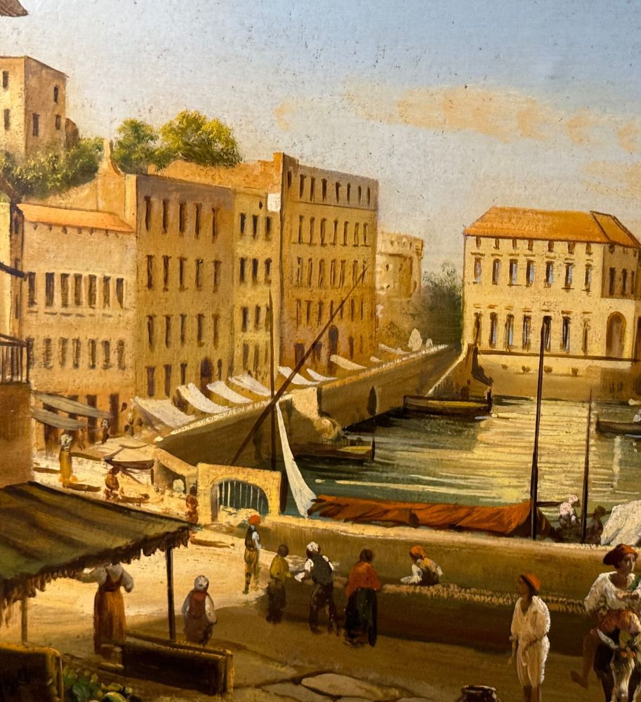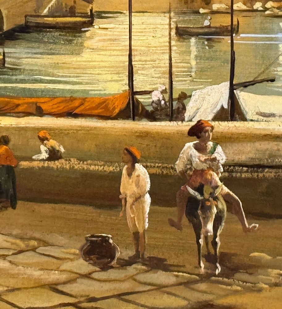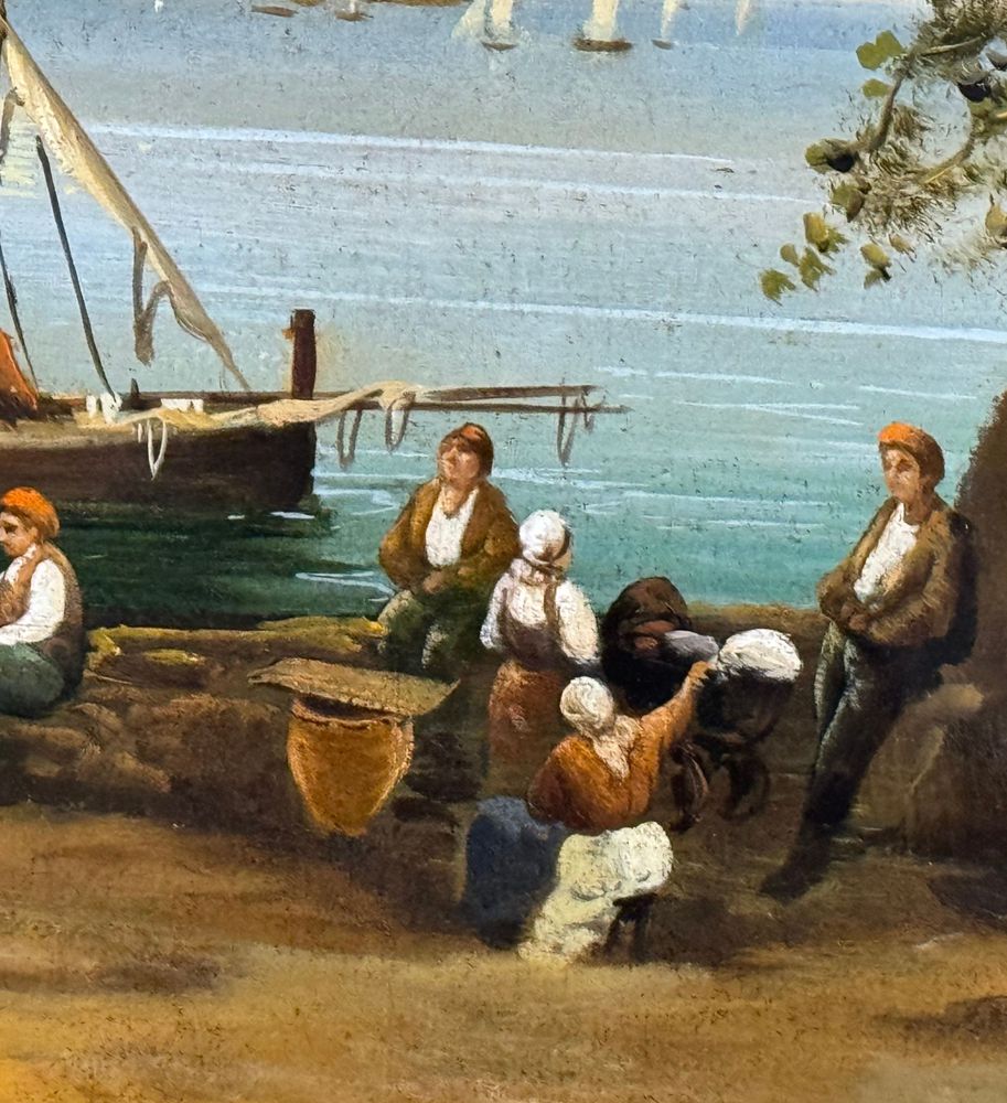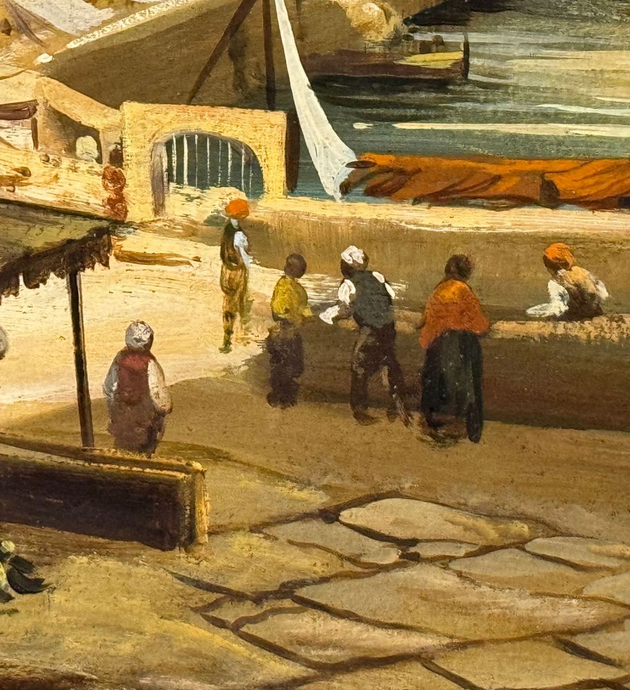 Dipinto olio su tavola, periodo XX secolo scuola italiana, raffigurante Città portuale. Dimensioni compreso cornice: 89x69 cm. Dimensioni interno cornice: 70x50 cm. Da artista anonimo. Opera in buone condizioni.