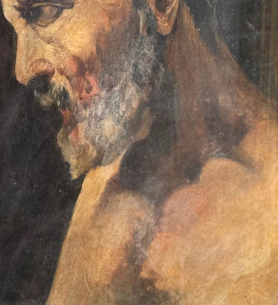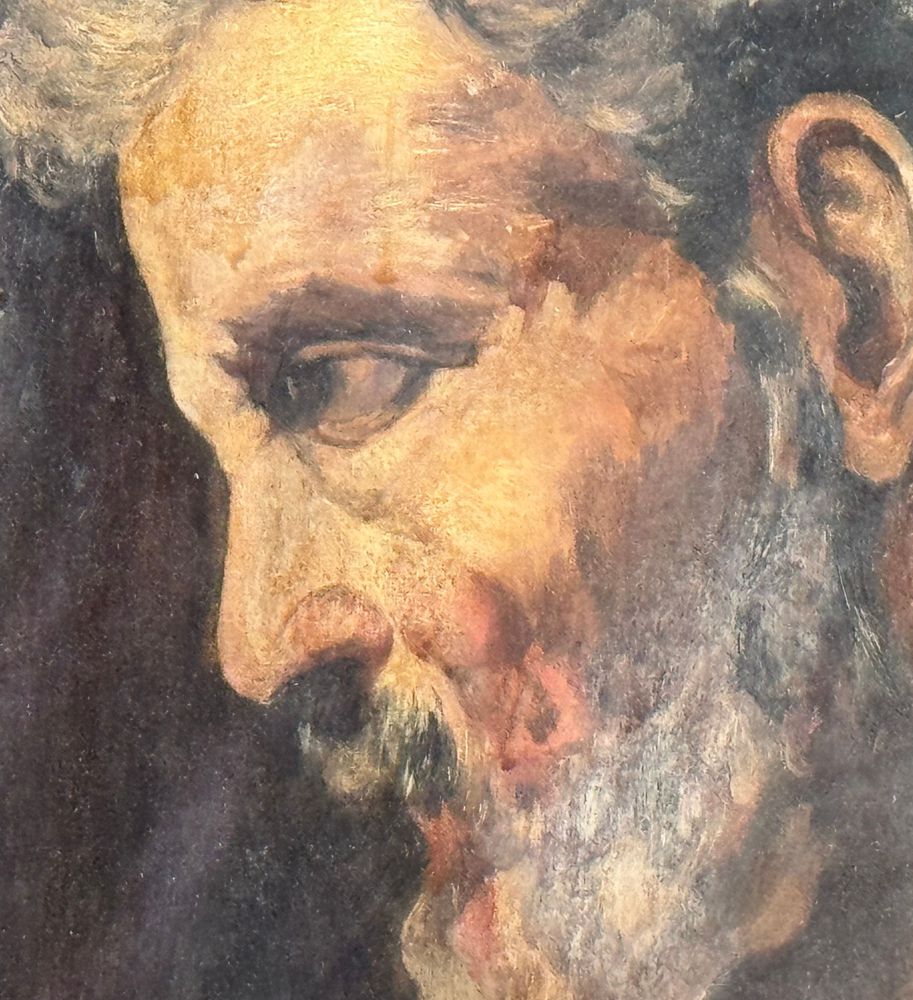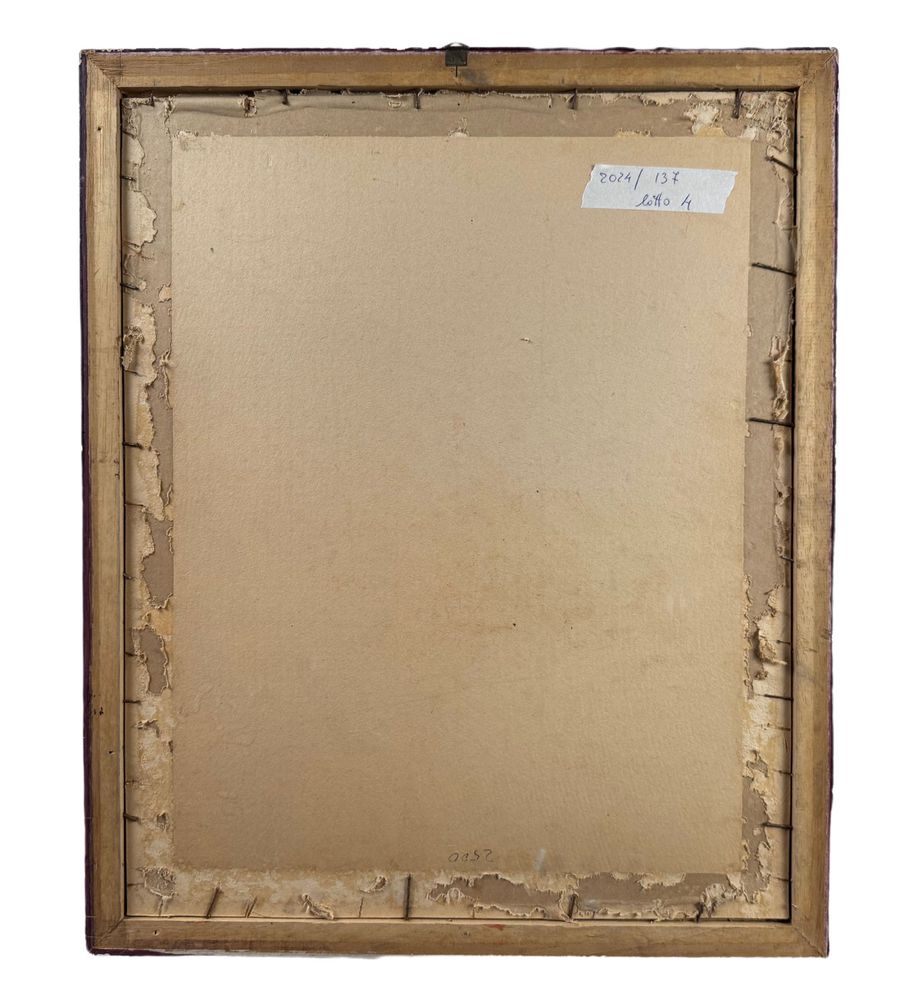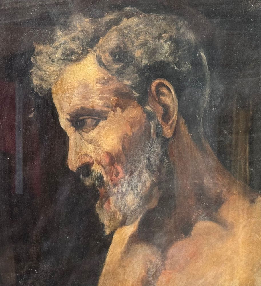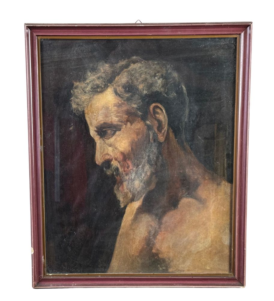 Dipinto olio su tela applicata su cartoncino, periodo XIX/XX secolo scuola Italiana, raffigurante Profilo di uomo. Dimensioni compreso cornice: 44x54 cm. Dimensioni interno cornice: 38x48 cm. Da artista anonimo. Opera in buone condizioni.