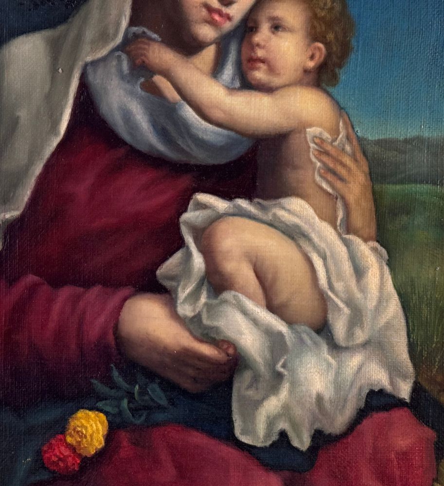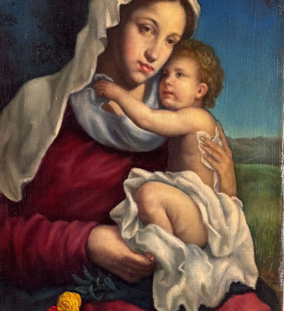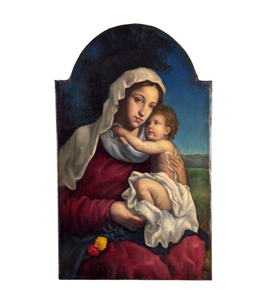 Dipinto olio su tela, periodo XIX secolo scuola Italiana, raffigurante Vergine e Bambino. Dimensioni: 43x71 cm. Da artista anonimo. Opera in buone condizioni. (Trasporto da boiserie su telaio). Proveniente da illustre famiglia Italiana. Il dipinto non presenta vecchi restauri.