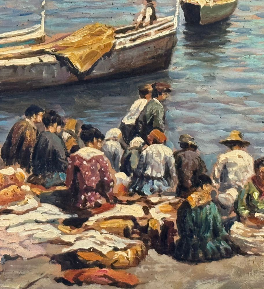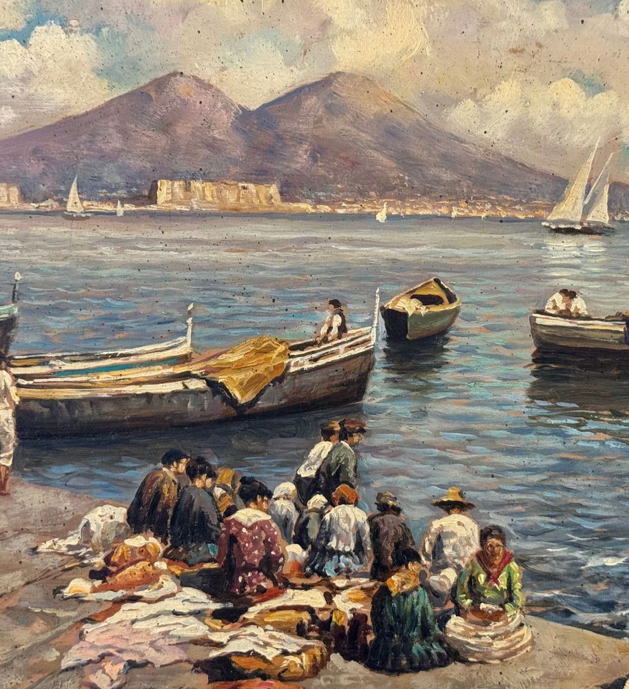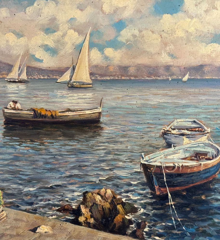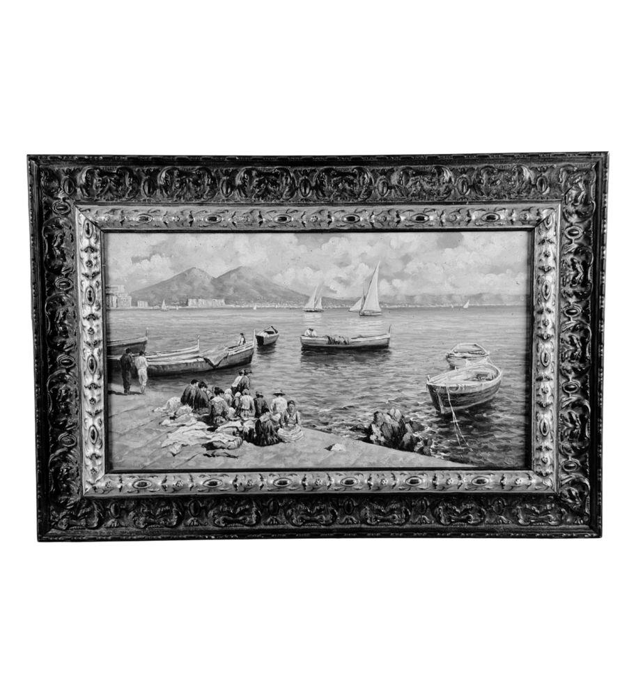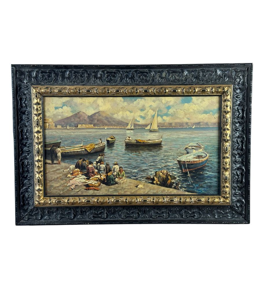 Dipinto olio su tavola, periodo XX secolo scuola Italiana, raffigurante Scorcio di marina napoletana. Dimensioni compreso cornice: 67x45 cm. Dimensioni interno cornice: 50x29 cm. Da artista anonimo. Opera in buone condizioni.