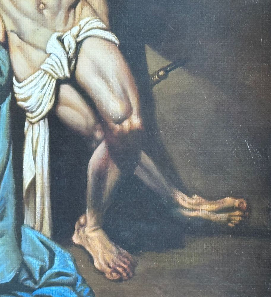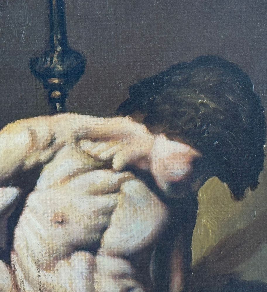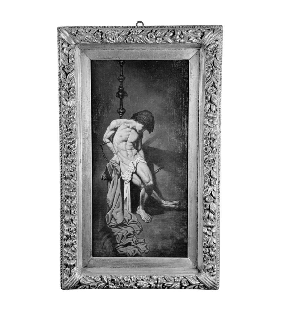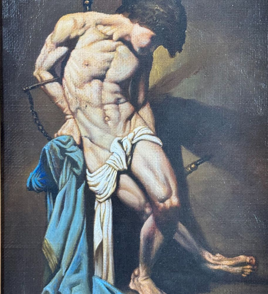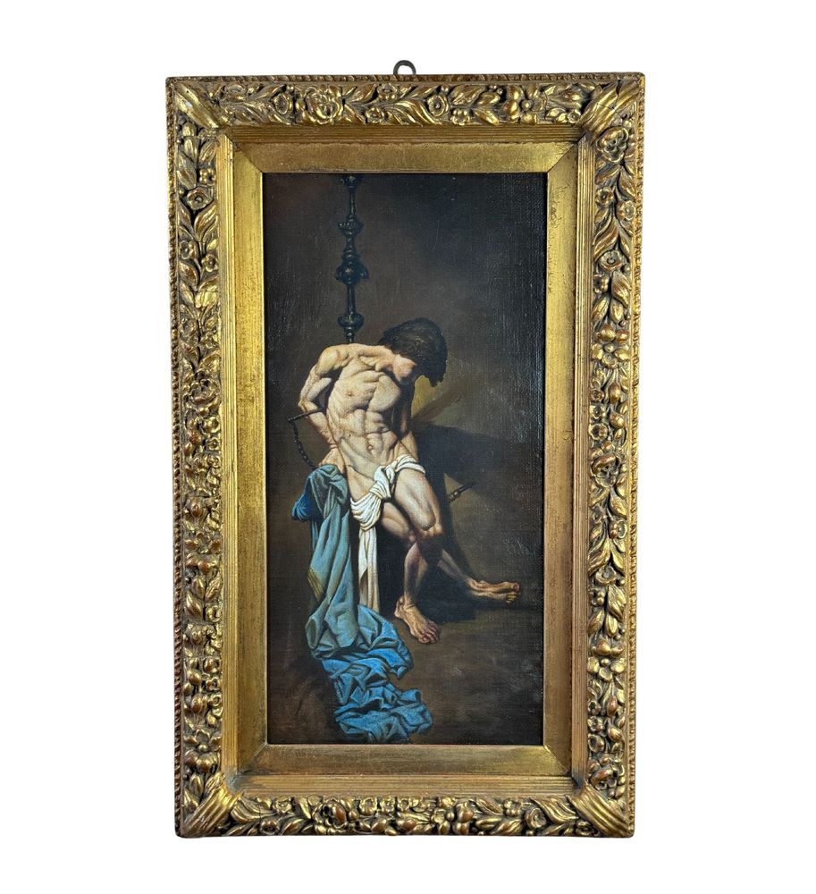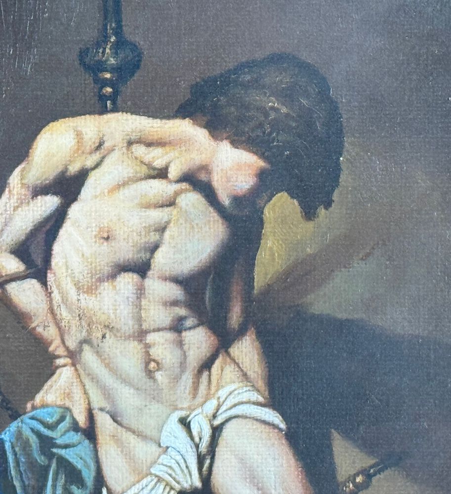 Dipinto olio su tela applicata su pannello, periodo XX secolo scuola Italiana, raffigurante San Sebastiano (copia d'autore). Dimensioni compreso cornice: 49x80 cm. Dimensioni interno cornice: 30x61 cm. Da artista anonimo (pittore accademico). Opera in buone condizioni.