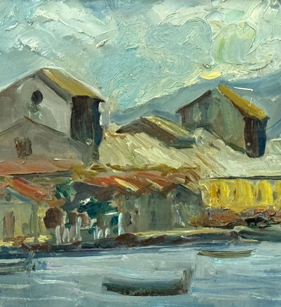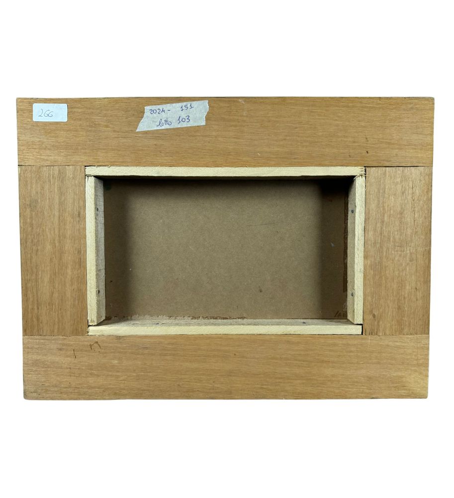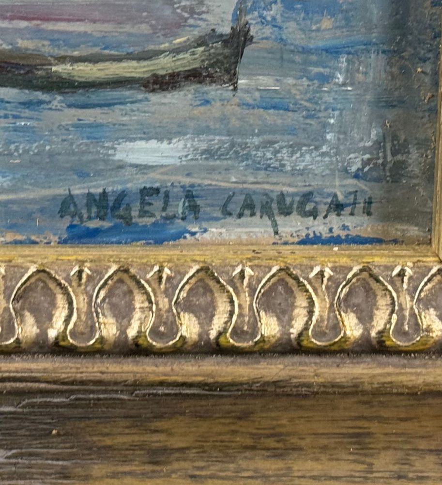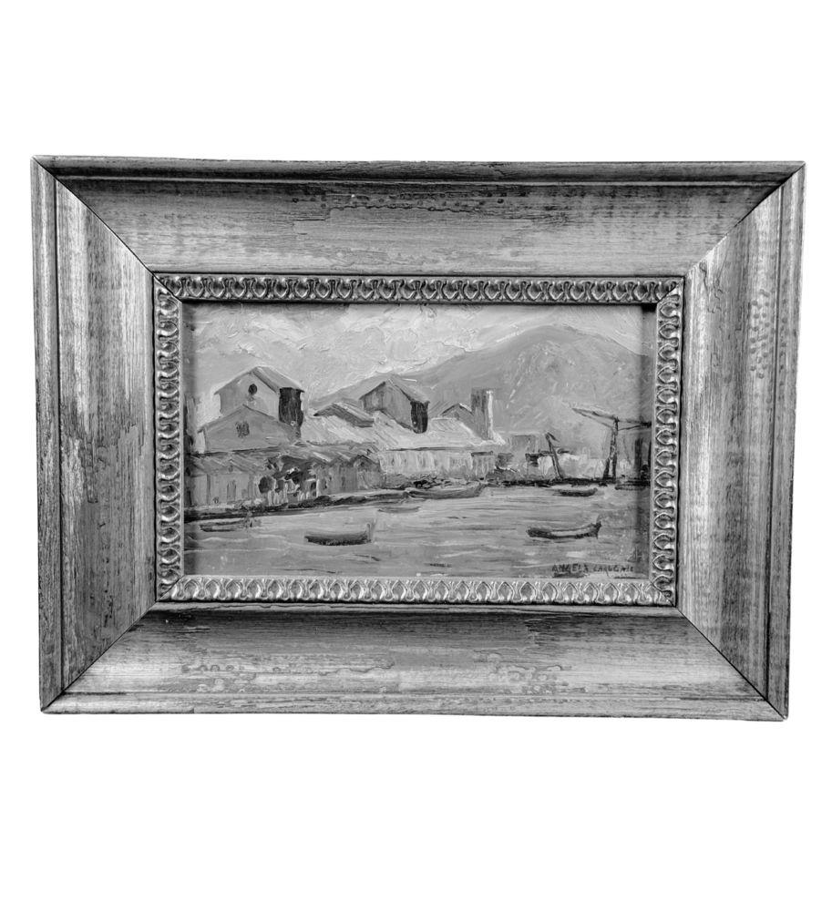 Dipinto olio su pannello, periodo XX secolo scuola italiana, raffigurante Paesaggio fluviale. Dimensioni compreso cornice: 45x33 cm. Dimensioni interno cornice: 30x18 cm. Reca firma in basso a destra da Angela Carugati (1881 - 1977). Opera in buone condizioni.