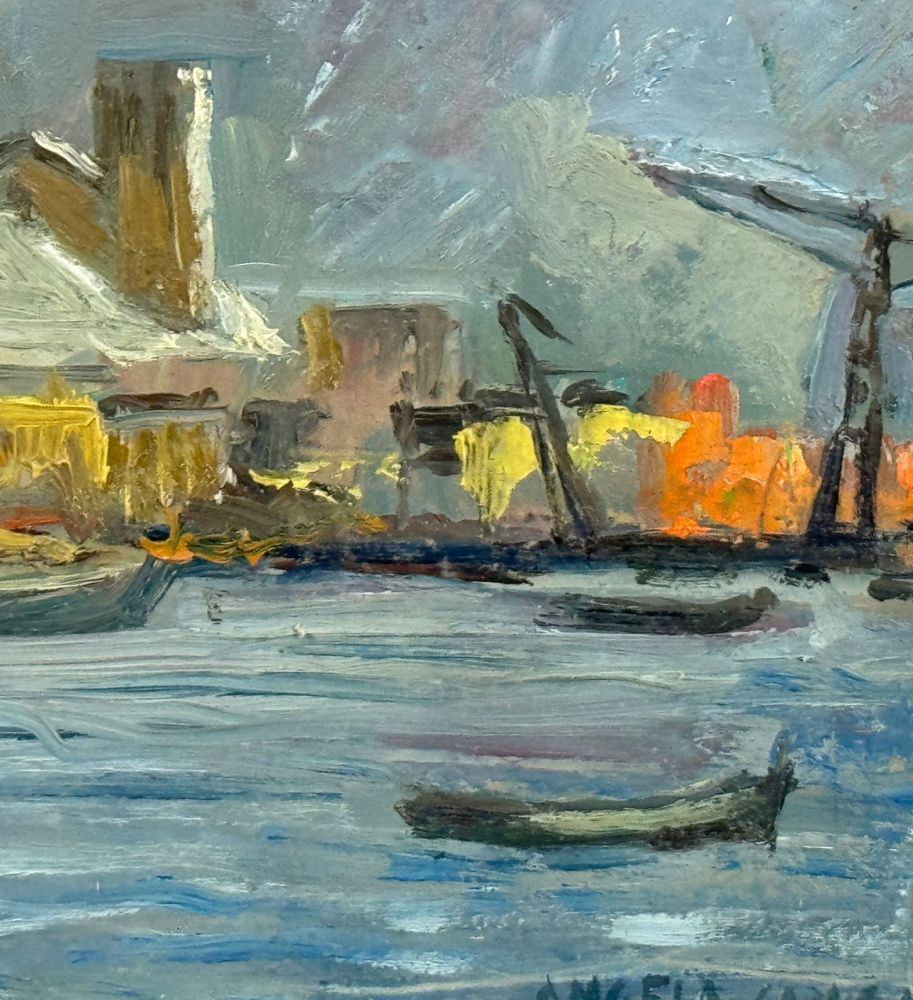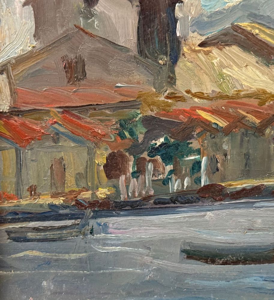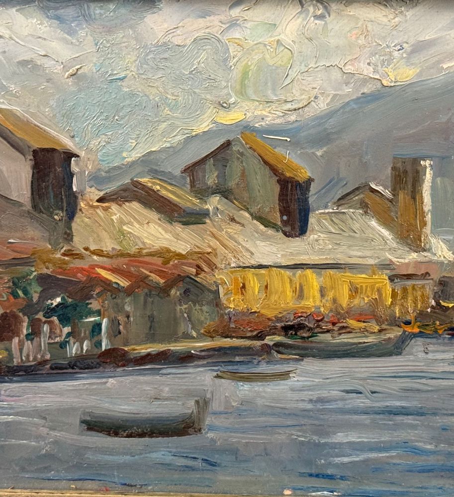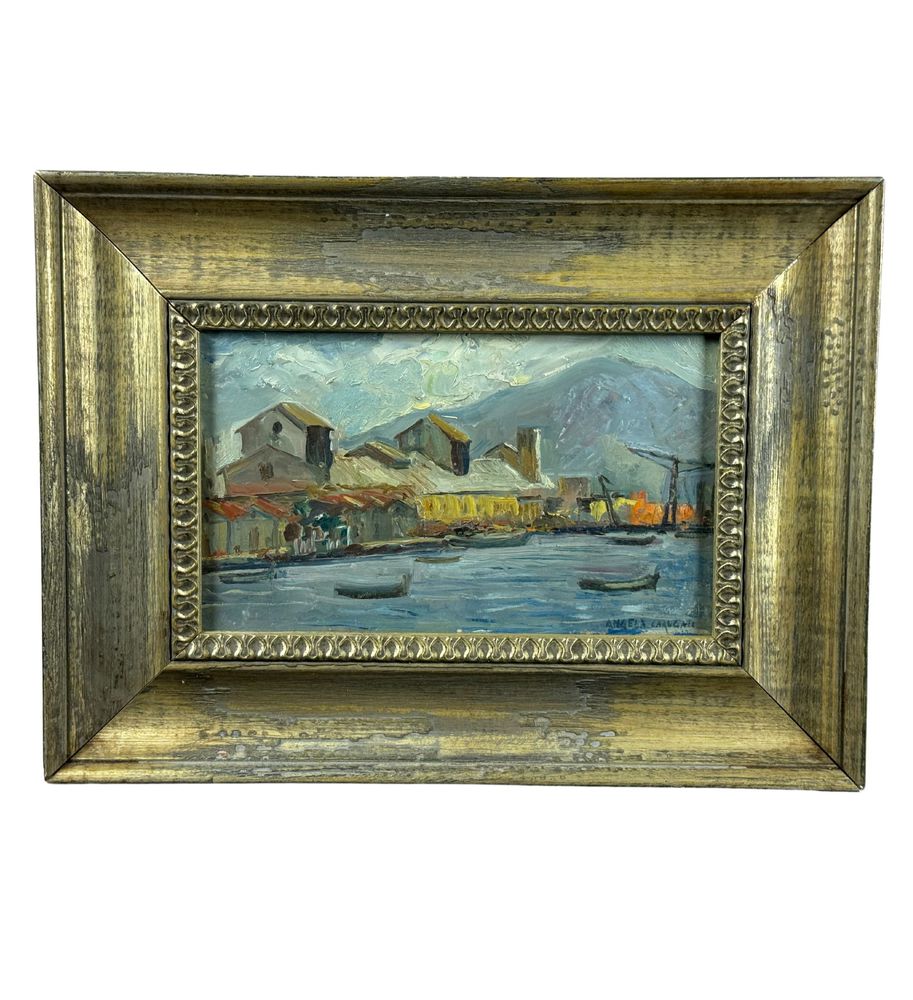 Dipinto olio su pannello, periodo XX secolo scuola italiana, raffigurante Paesaggio fluviale. Dimensioni compreso cornice: 45x33 cm. Dimensioni interno cornice: 30x18 cm. Reca firma in basso a destra da Angela Carugati (1881 - 1977). Opera in buone condizioni.