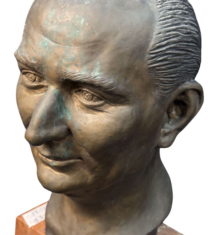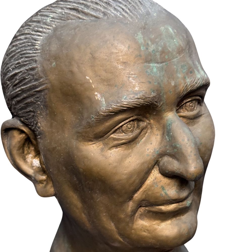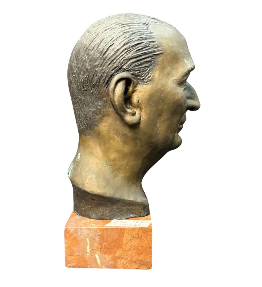 Scultura in bronzo, patinato a cera persa su base in marmo, periodo XX secolo, raffigurante Guglielmo Marconi. Reca firma e sigla Frascione. Dimensioni: 40x18x14 cm. Opera in buone condizioni.