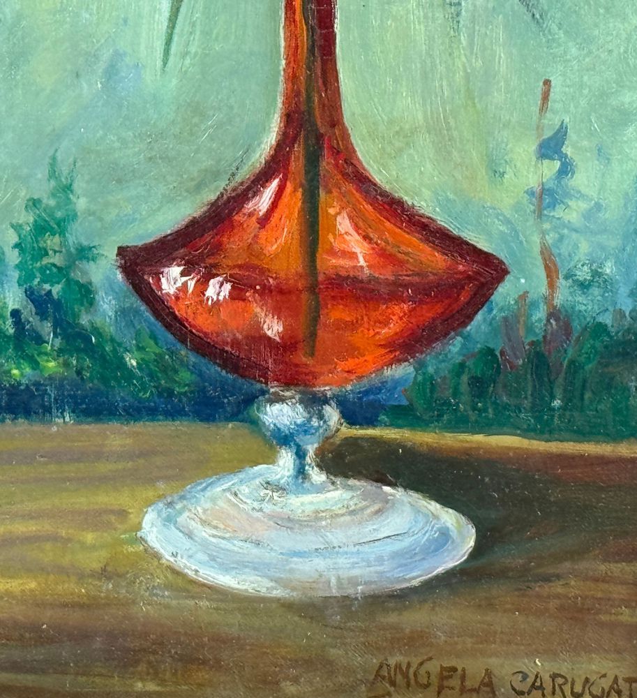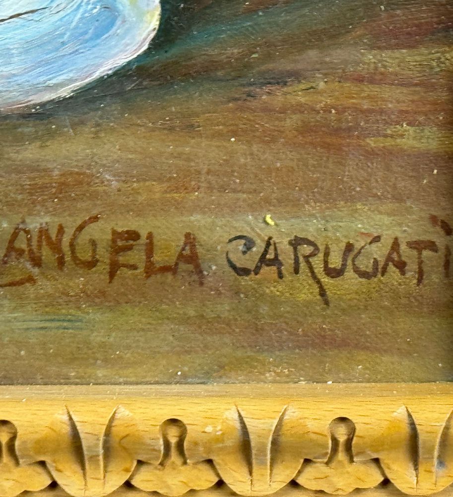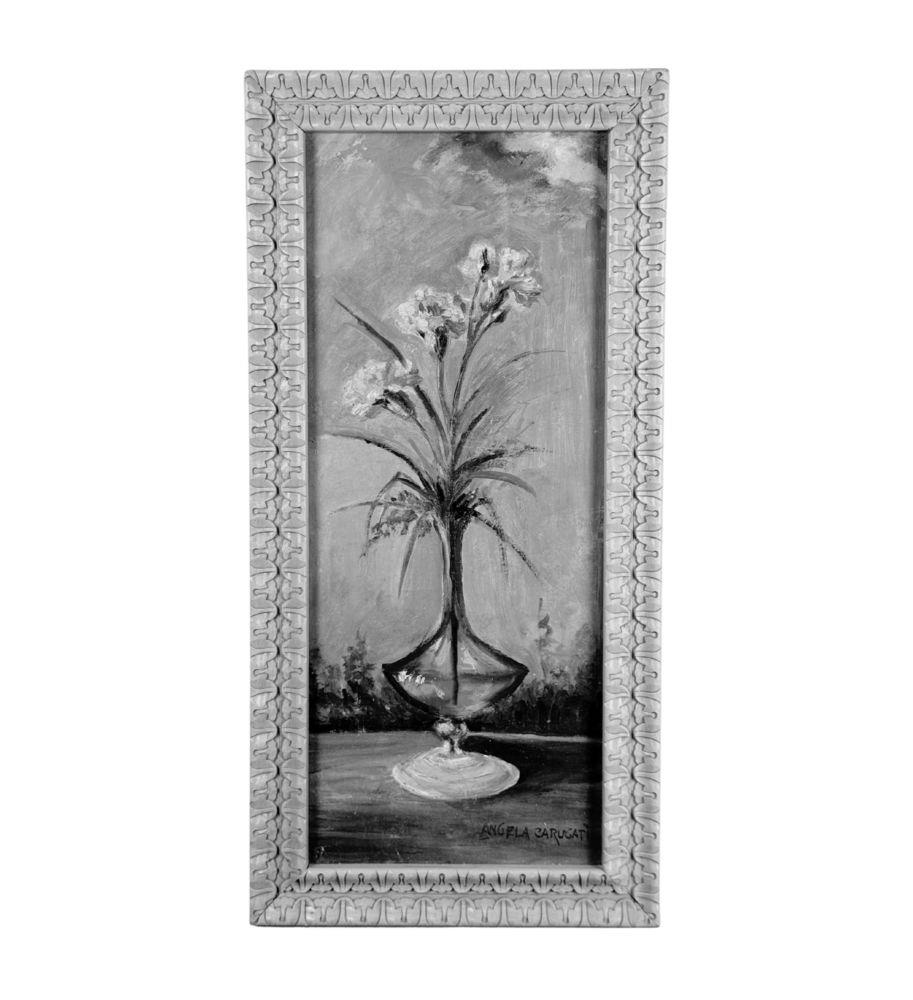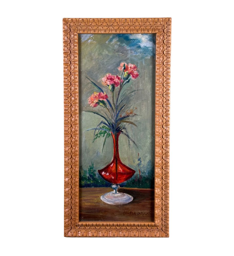 Dipinto olio su tela applicata su pannello, periodo XX secolo scuola Italiana, raffigurante Vaso con fiori. Dimensioni compreso cornice: 33x69 cm. Dimensioni interno cornice: 24x59,5 cm. Reca firma in basso a destra da Angela Carugati (1881 - 1977). Opera in buone condizioni.